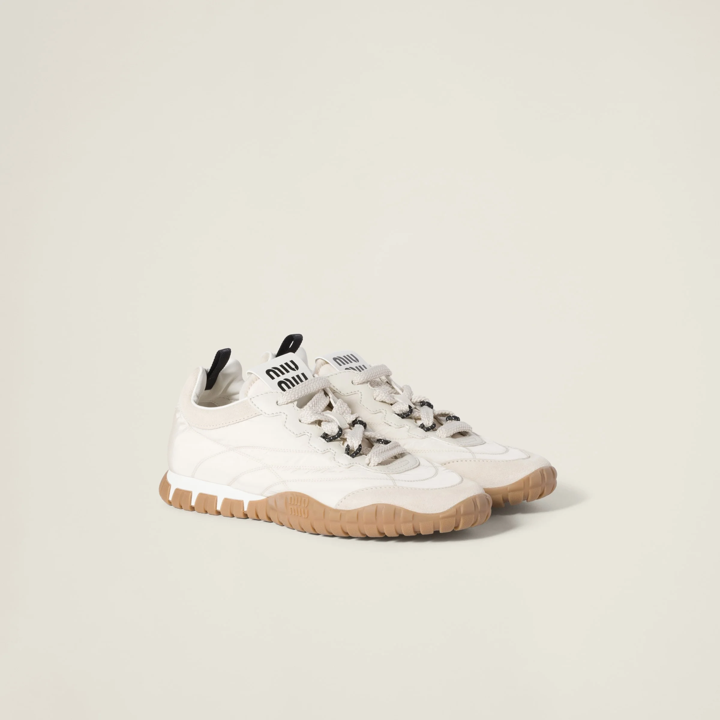 Tyre combines elegance and sporty functionality. The dynamic rubber sole, which is flexible and scuff-proof, recalls the pattern on tires. Made of technical fabric and suede, these sneakers express Miu Miu's bold identity. - Product code: 5E417E_ZJM_F0304_F_005 - Laces closure - Fabric and leather lining - Screen-printed logo on the tongue, heel collar, and insole - EVA and rubber sole with logo - Star-patterned tread - Removable leather-covered insole - Imported Materials Main material: Recycled Polyamide