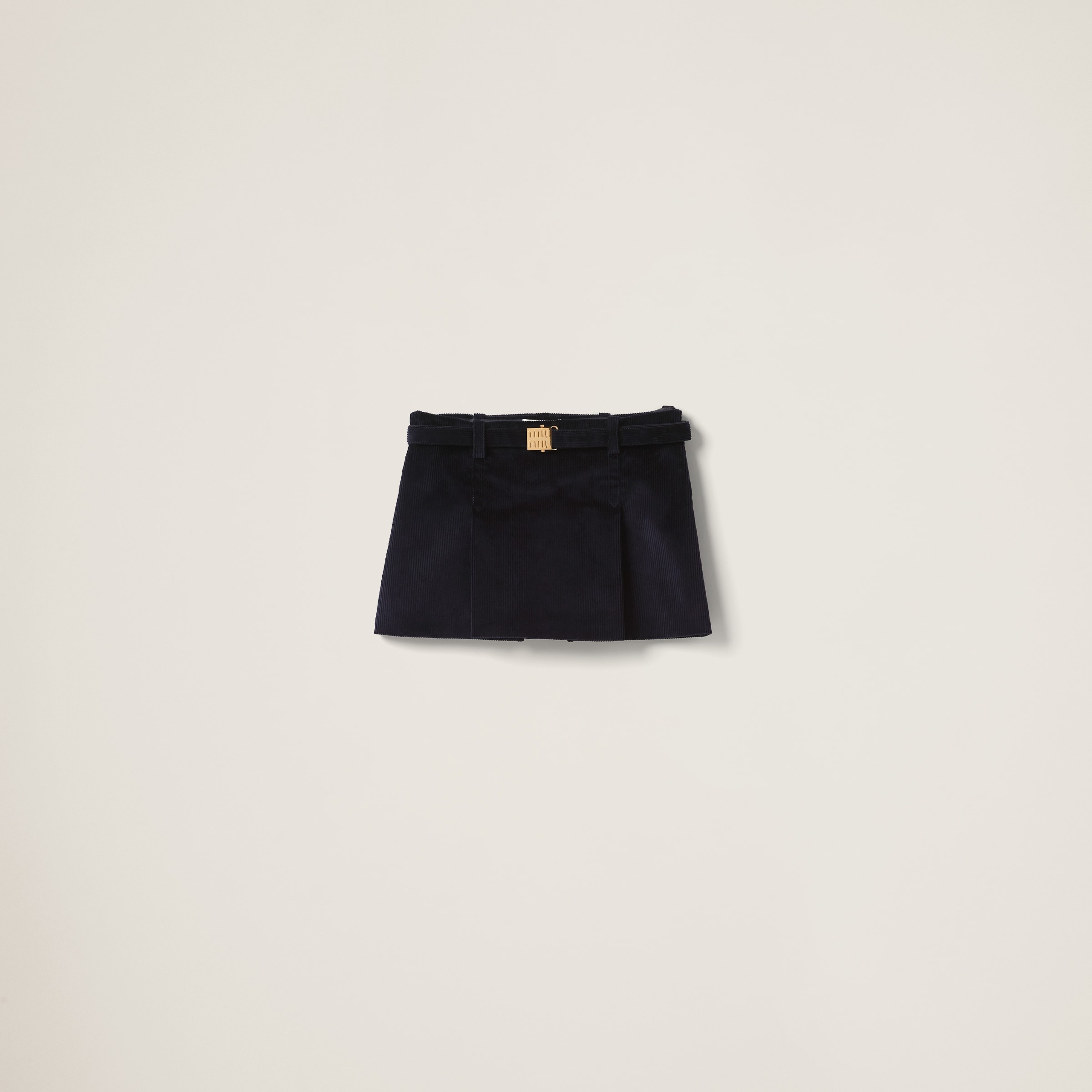 The soft, textured feel of corduroy meets bold Miu Miu style in this miniskirt. The lining makes wearing particularly pleasant while the logo on the buckle it completes the design with an iconic and distinctive note. - Product code: MG2064_13I4_F0124_S_232 - Mini length - Side zipper closure - Logo on buckle - Lined garment - Imported - The model is 179 cm tall and wears a size 38 Height 26cm Materials Main material: 100% Cotton