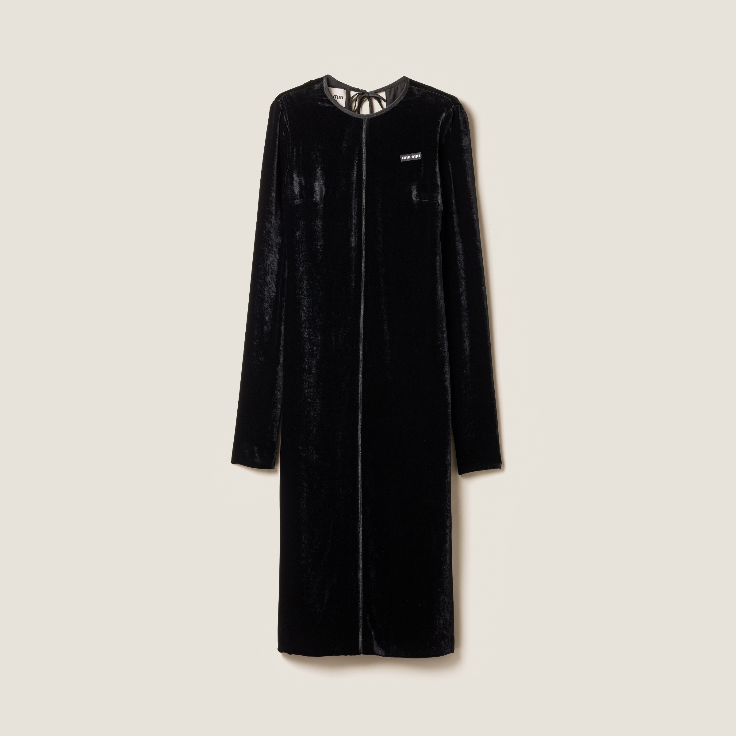 This velvet dress stands out for its seductive and sophisticated essence. The velvet, treated like jersey, gives this evening dress a unique fit. - Product code: MF5492_10BA_F0002_S_OOO - Slim fit - Lined garment - Long sleeves - Round neck - Back closure with laces - Knit logo label - Imported - The model is 178 cm tall and wears a size 38 Height 120cm Materials Main material: 20% Silk 80% Viscose