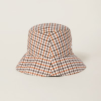 The casual style of this vichy hat is combined with the iconic character of the Miu Miu logo. The accessory is accompanied by a practical drawstring pouch with logo. - Product code: 5RM048_2CVG_F0WZU - Includes hat - Drawstring closure - Rubberized lettering logo - Imported