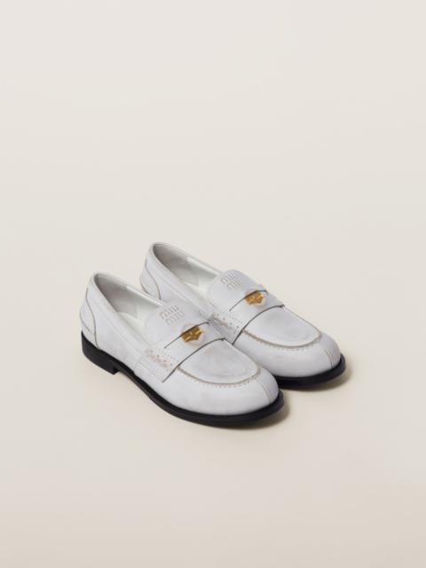 In the '50s, loafers were part of school uniforms worn by U.S. prep school and college students. Annoyed by having to wear a uniform, students started inserting a shiny penny in the slot of the leather band, giving rise to the name "Penny Loafers". Miu Miu gives this timeless footwear synonymous with tradition an update in a vintage version. - Product code: 5D773D_3G48_F0002_F_020 - Apron with leather band and metal ornament - Leather lining - Embossed logo on the tongue - Rubber sole - 20 mm heel - Leather insole - Imported