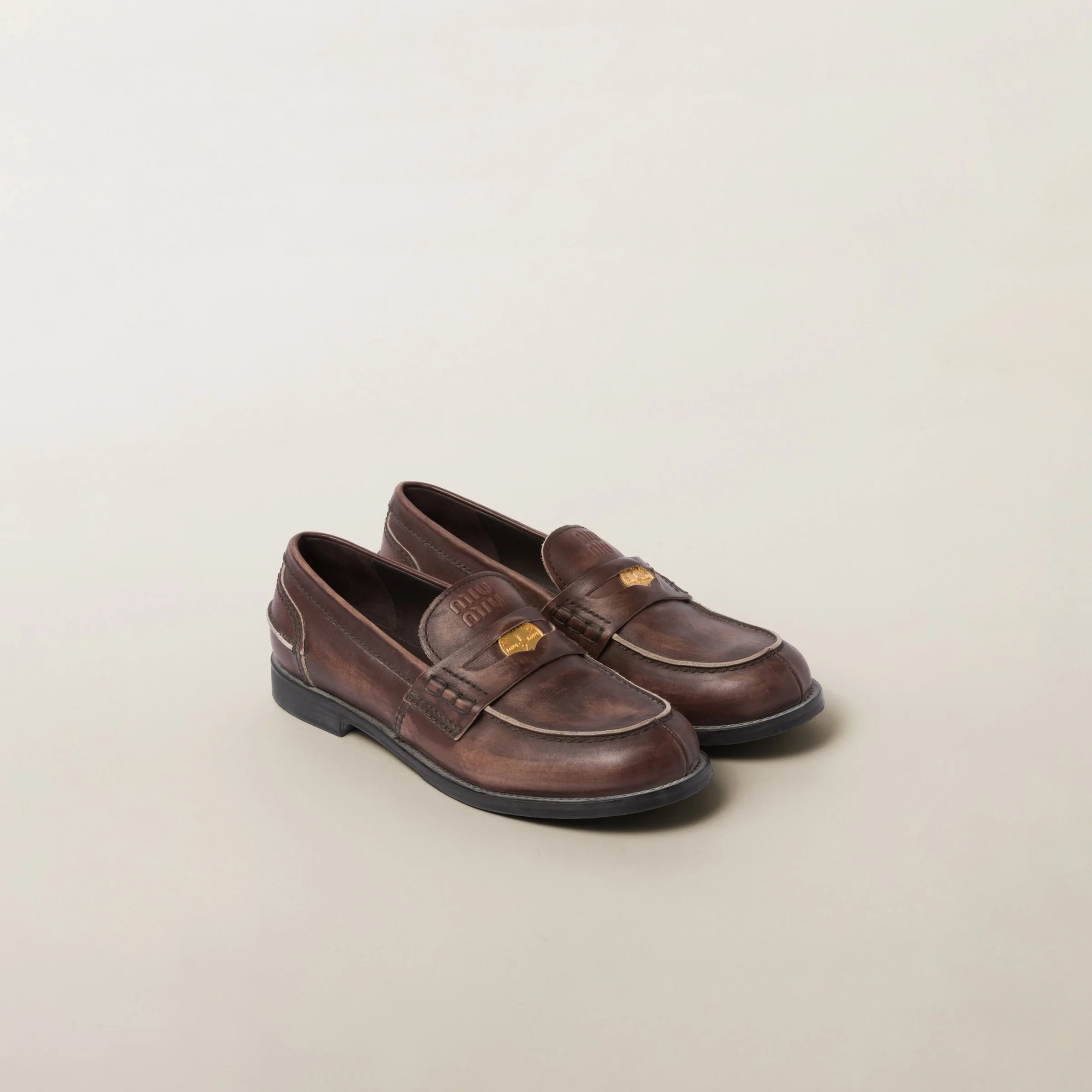 In the '50s, loafers were part of school uniforms worn by U.S. prep school and college students. Annoyed by having to wear a uniform, students started inserting a shiny penny in the slot of the leather band, giving rise to the name "Penny Loafers". Miu Miu gives this timeless footwear synonymous with tradition an update in a vintage version. - Product code: 5D773D_3G48_F0192_F_020 - Apron with leather band and metal ornament - Leather lining - Embossed logo on the tongue - Rubber sole - 20 mm heel - Leather insole - Imported Materials Main material: Calfskin