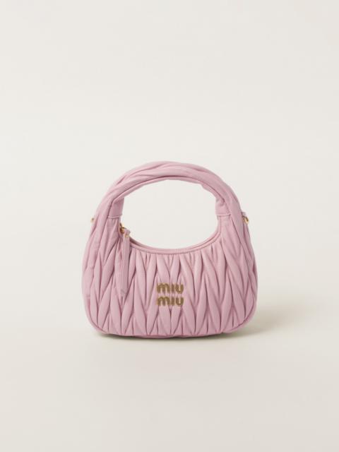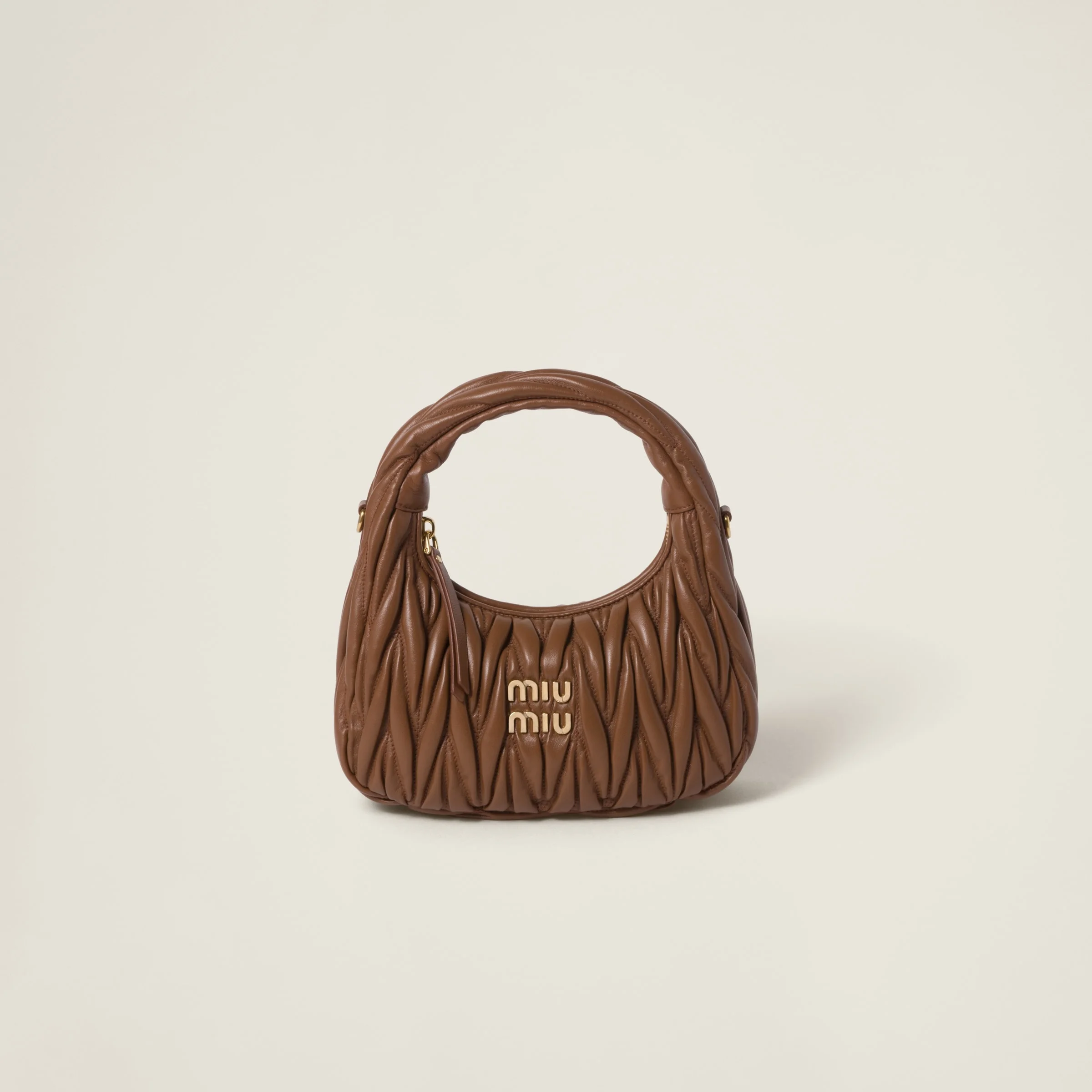 The Wander bag is reinterpreted season after season, becoming an iconic accessory of Miu Miu collections. Made of matelasse nappa leather, the bag is characterized by the sophisticated, three-dimensional effect created by the refined workmanship. The hobo shape, blending retro inspirations and contemporary elegance, becomes a new synonym of modern femininity. - Product code: 5BC125_AN88_F098L_V_OOY - Matelasse motif - Leather shoulder strap, length 110 cm - Gold-tone hardware - Metal lettering logo on the front - Zipper closure - Cotton satin lining - This bag can hold a phone 16 cm x 7.8 cm x 0.76 cm in size - The small Miu Miu wallet can be conveniently placed in this bag - Imported Height 17cm Width 20cm Length 6cm Materials Main material: Lambskin