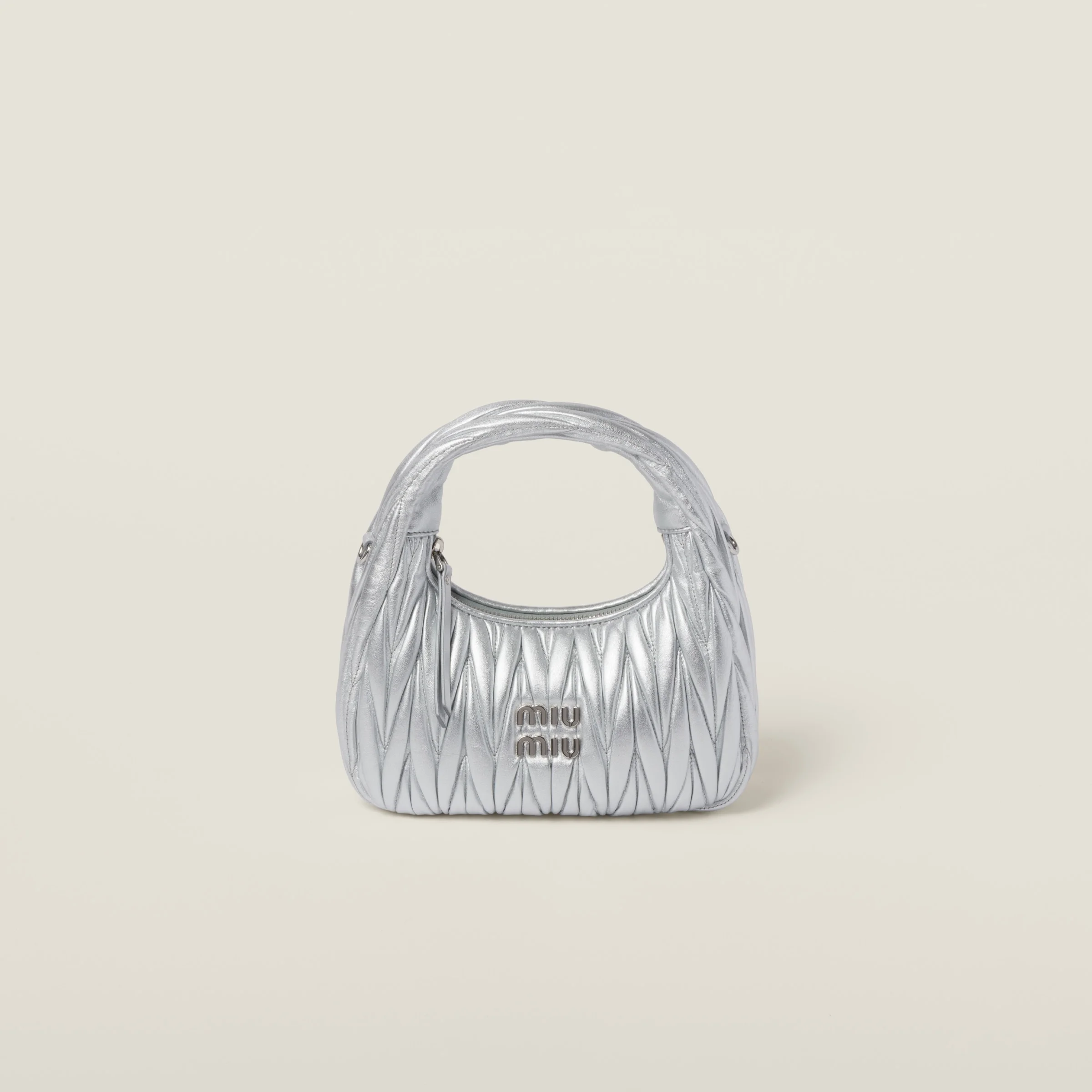 The Wander bag is reinterpreted season after season, becoming an iconic accessory of Miu Miu collections. Made of matelasse nappa leather, the bag is characterized by the sophisticated, three-dimensional effect created by the refined workmanship. The hobo shape, blending retro inspirations and contemporary elegance, becomes a new synonym of modern femininity. - Product code: 5BC125_AN88_F0118_V_OOY - Matelasse motif - Leather shoulder strap, length 110 cm - Gold-tone hardware - Metal lettering logo on the front - Zipper closure - Cotton satin lining - This bag can hold a phone 16 cm x 7.8 cm x 0.76 cm in size - The small Miu Miu wallet can be conveniently placed in this bag - Imported Height 17cm Width 20cm Length 6cm Materials Main material: Lambskin