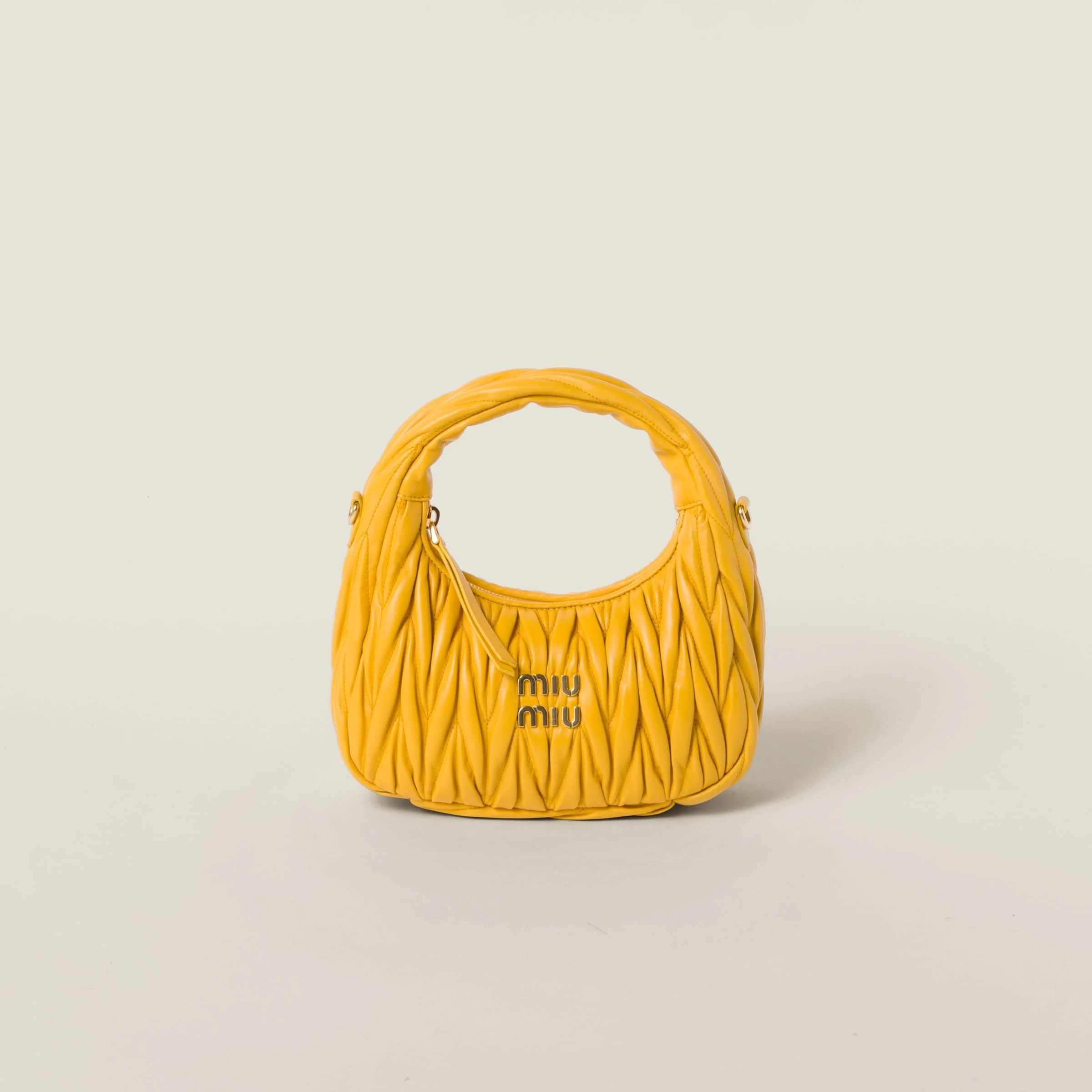 The Wander bag is reinterpreted season after season, becoming an iconic accessory of Miu Miu collections. Made of matelasse nappa leather, the bag is characterized by the sophisticated, three-dimensional effect created by the refined workmanship. The hobo shape, blending retro inspirations and contemporary elegance, becomes a new synonym of modern femininity. - Product code: 5BC125_N88_F065Y_V_OOY - Matelasse motif - Leather shoulder strap, length 110 cm - Gold-tone hardware - Metal lettering logo on the front - Zipper closure - Cotton satin lining - This bag can hold a phone 16 cm x 7.8 cm x 0.76 cm in size - The small Miu Miu wallet can be conveniently placed in this bag - Imported