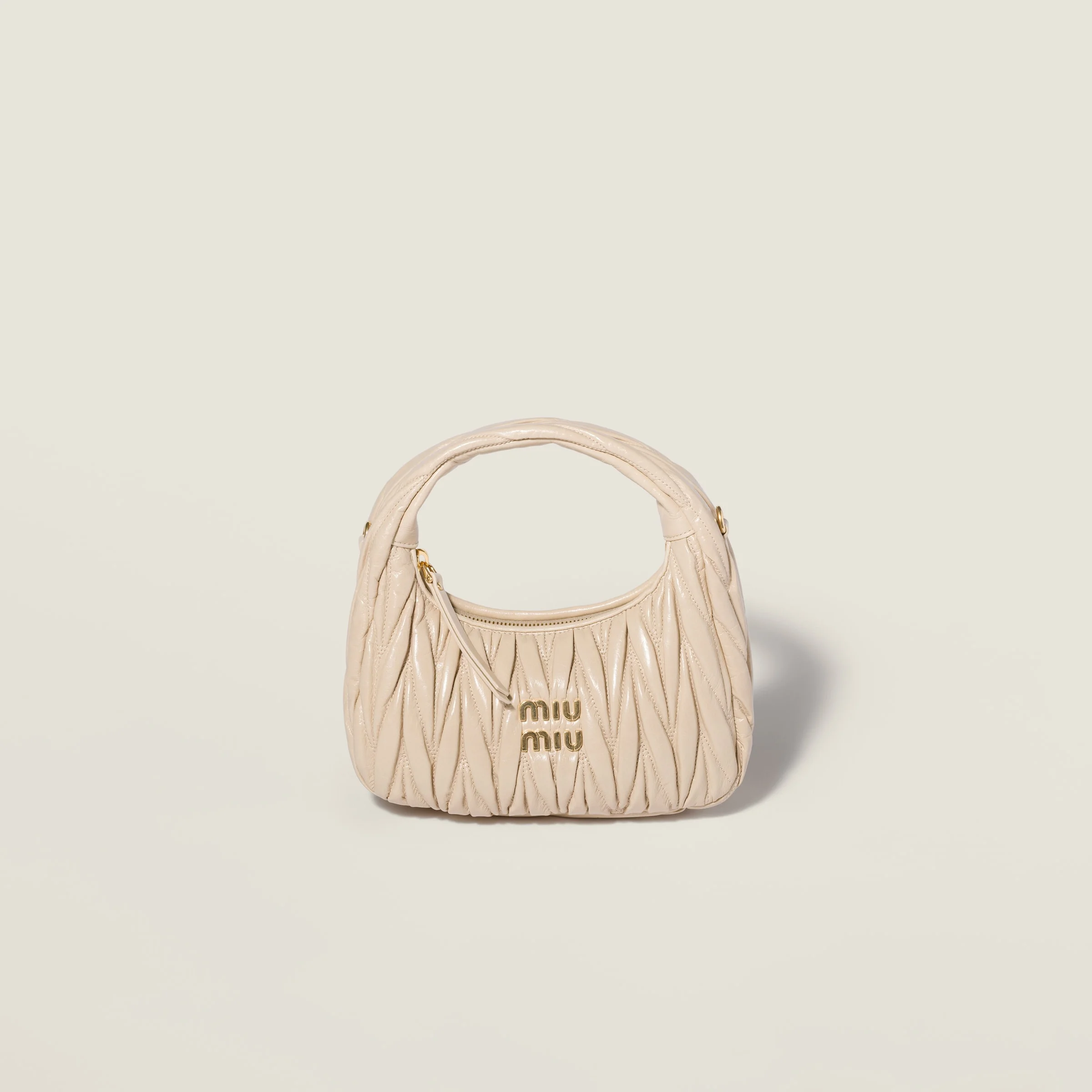 Soft leather with a glossy effect and the sophisticated matelasse motif define the three-dimensional texture of the Wander bag, enhancing its iconic hobo shape as an expression of versatile, artisanal elegance. - Product code: 5BC125_2DNV_F0485_V_OOY - Matelasse motif - Leather handle - Detachable leather shoulder strap, length: 150 cm - Gold-tone hardware - Zipper closure - Satin cotton interior - Metal lettering logo on the front - Imported Height 17cm Width 20cm Length 6cm Materials Main material: Calfskin