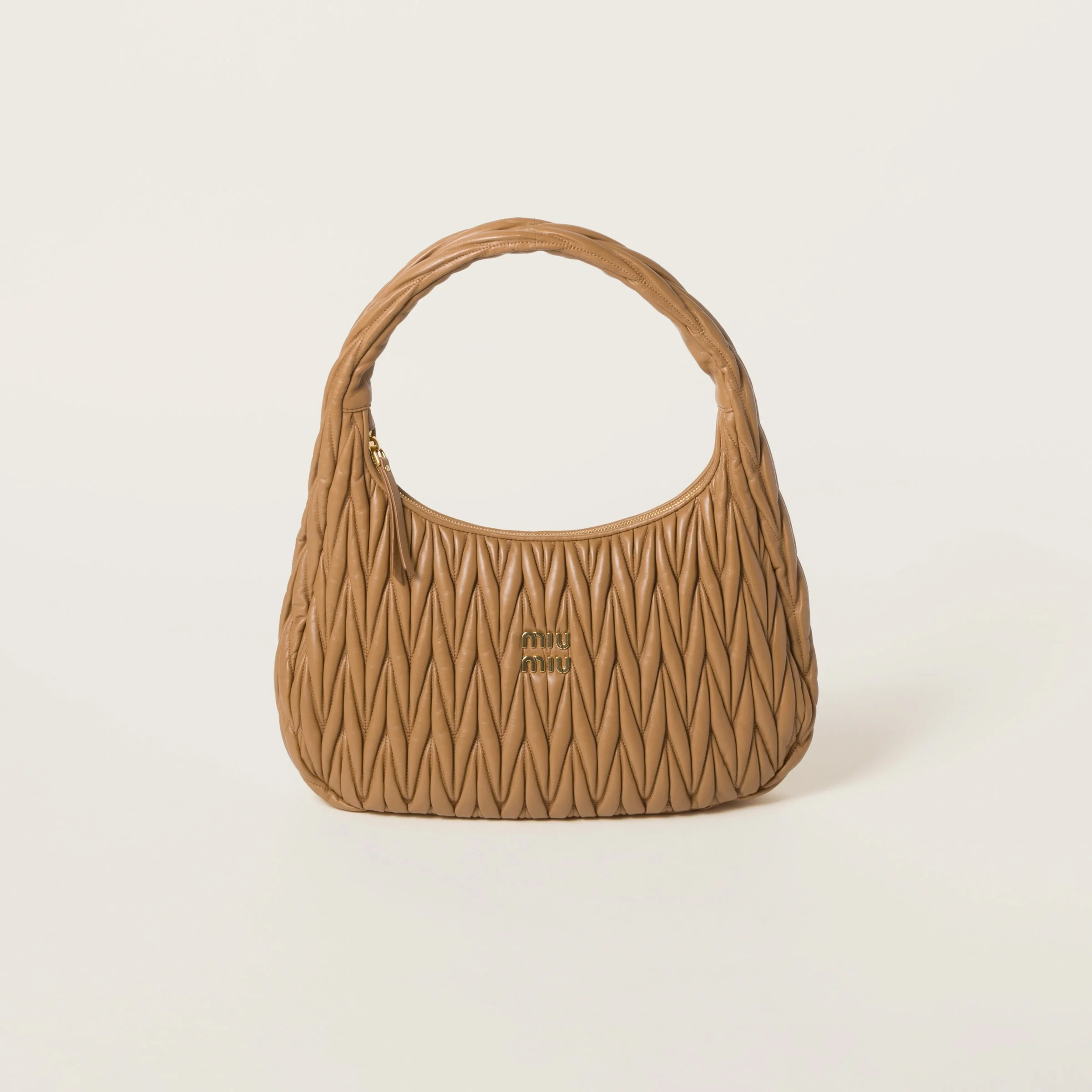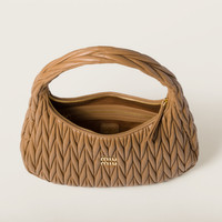 The Wander bag is reinterpreted season after season, becoming an iconic accessory of Miu Miu collections. Made of matelasse nappa leather, the bag is characterized by the sophisticated, three-dimensional effect created by the refined workmanship. The hobo shape, blending retro inspirations and contemporary elegance, becomes a new synonym of modern femininity. - Product code: 5BC170_N88_F098L_V_OOO - Matelasse motif - Gold-tone hardware - Zipper closure - Cotton satin lining with zipper pocket - Metal lettering logo on the front - Imported Height 27cm Width 35cm Length 4.5cm Materials Main material: Lambskin