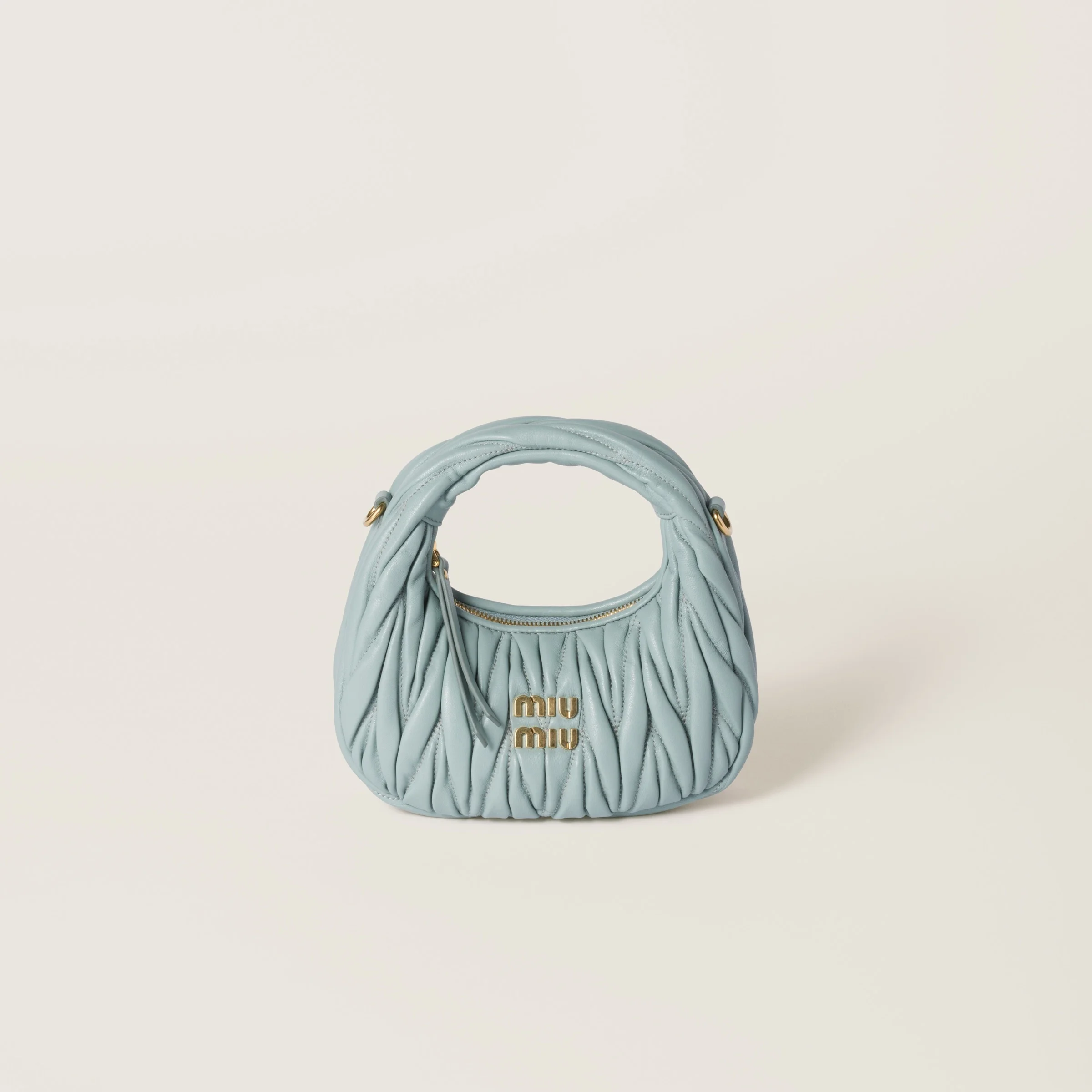 This mini version of the Wander matelasse nappa leather bag is characterized by the sophisticated three-dimensional effect created by the exquisite workmanship. The hobo shape, blending retro inspirations and contemporary elegance, becomes a new synonym of modern femininity. - Product code: 5BP078_AN88_F0035_V_OOO - Matelasse workmanship - Leather 110 cm shoulder strap - Gold-tone hardware - Metal lettering logo on the front - Zipper closure - Cotton satin lining - This bag can hold a phone 14cm x 7.1cm x 0.77cm in size - The Miu Miu card holder easily fits in this bag - Imported Height 14cm Width 17.5cm Length 5.5cm Materials Main material: Lambskin