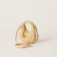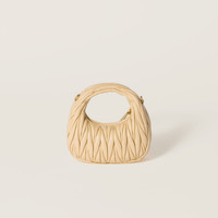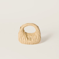 This mini version of the Wander matelasse nappa leather bag is characterized by the sophisticated three-dimensional effect created by the exquisite workmanship. The hobo shape, blending retro inspirations and contemporary elegance, becomes a new synonym of modern femininity. - Product code: 5BP078_AN88_F0K57_V_OOO - Matelasse workmanship - Leather 110 cm shoulder strap - Gold-tone hardware - Metal lettering logo on the front - Zipper closure - Cotton satin lining - This bag can hold a phone 14cm x 7.1cm x 0.77cm in size - The Miu Miu card holder easily fits in this bag - Imported Height 14cm Width 17.5cm Length 5.5cm Materials Main material: Lambskin