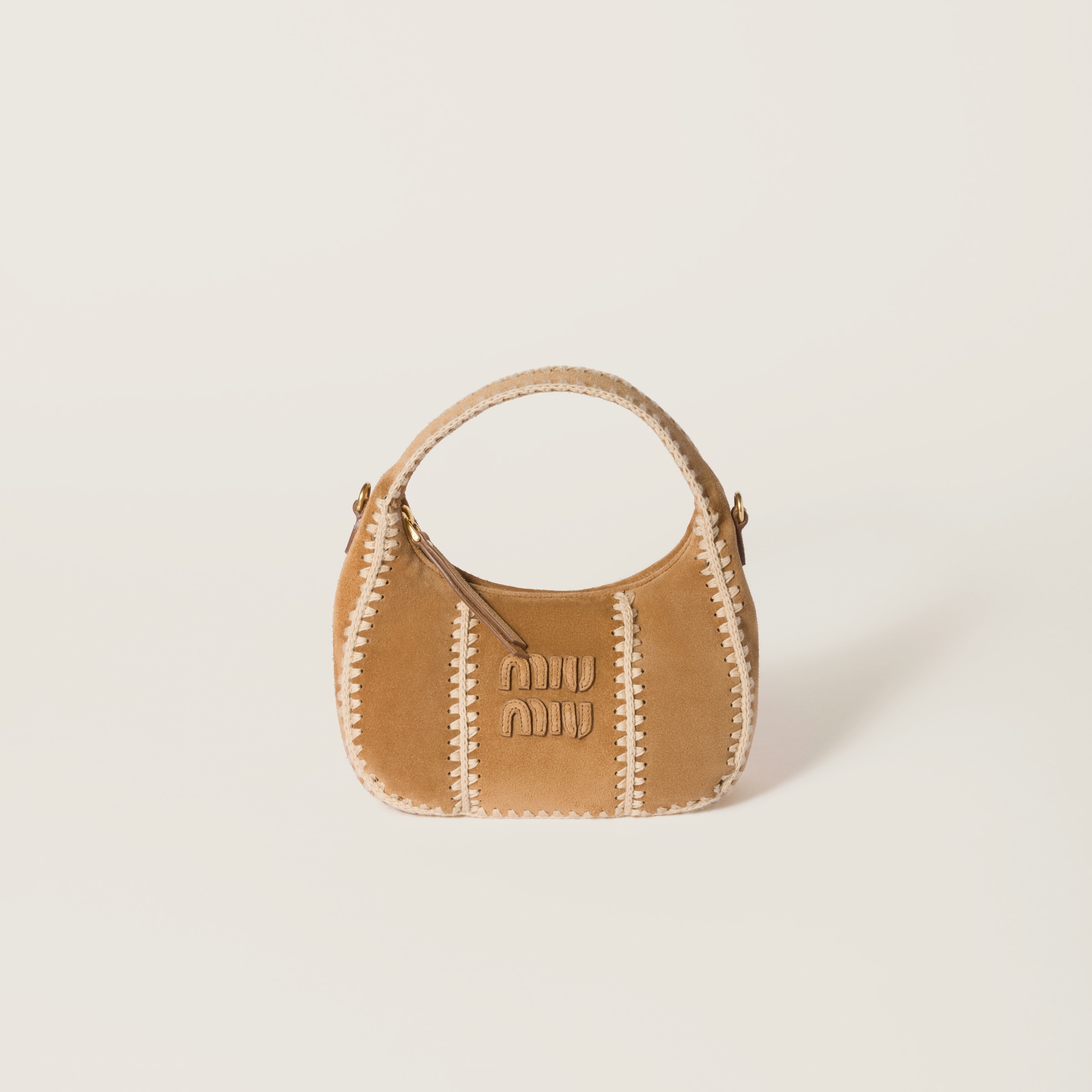 The soft texture of suede blends with refined crochet workmanship, enhancing the iconic lines of the Wander bag in a sleek small version with elegant natural colors and unique details. - Product code: 5BC125_2IBG_F0401_V_OWR - Detachable leather shoulder strap, length 110 cm - Maximum drop: 60 cm - Gold-tone hardware - Zipper closure - Linen blend interior - Leather lettering logo on the front - Imported Height 17cm Width 20cm Length 6cm Materials Main material: Calfskin