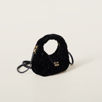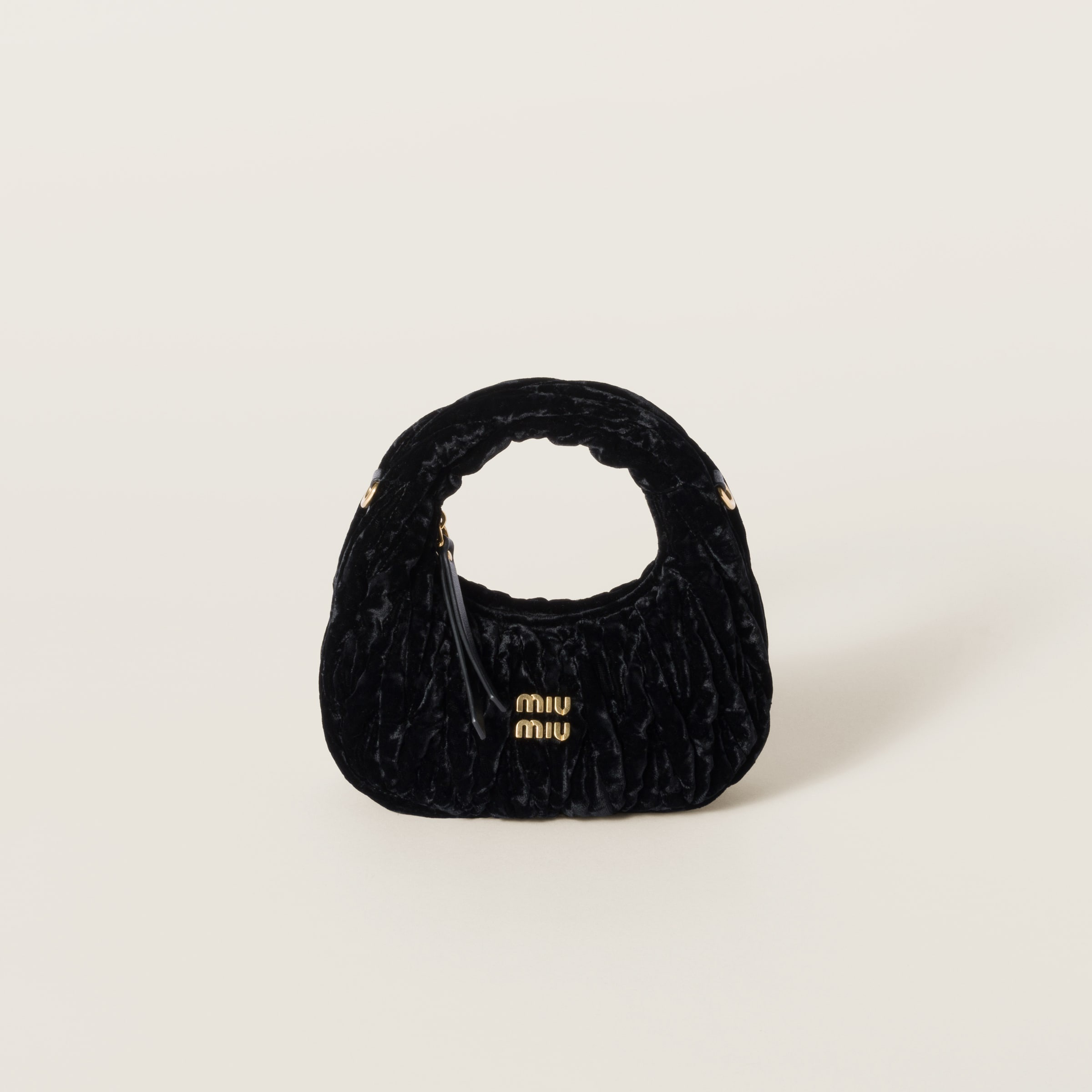 The versatile essence of the Wander bag is enhanced by its special mini size. The soft velvet adds a unique touch to this exclusive staple of the Miu Miu wardrobe. - Product code: 5BP078_2CVH_F0002_V_OOO - Matelasse motif - Removable leather shoulder strap, length 110 cm - Maximum drop 58 cm - Gold-tone hardware - Zipper closure - Cotton satin lining - Metal lettering logo on the front - Imported Height 14cm Width 17.5cm Length 5.5cm