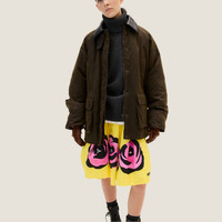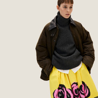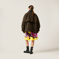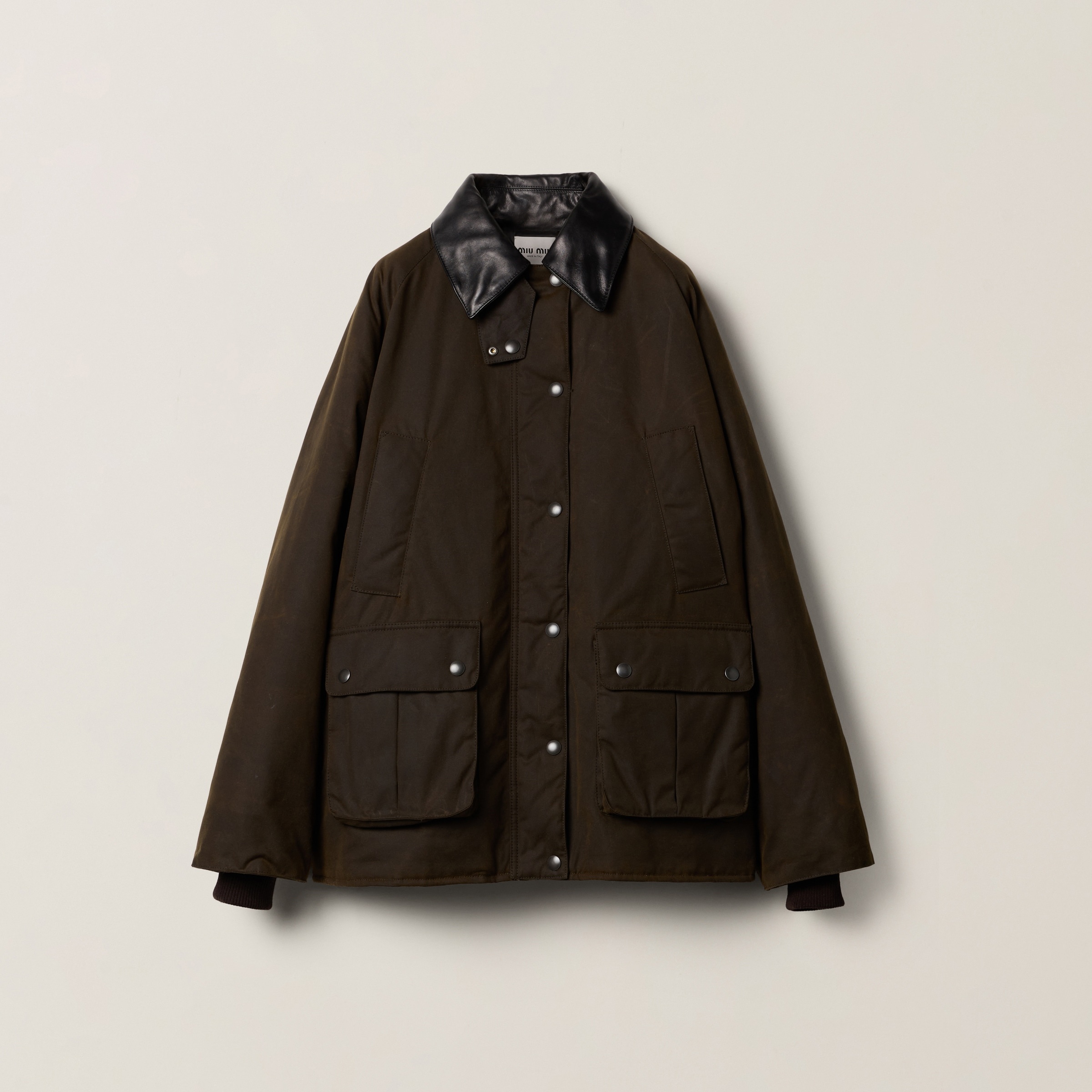 A play of contrasts and oversized lines characterizes this waxed canvas blouson jacket. The Miu Miu logo adds its signature touch to this stylish version. - Product code: ML1104_15WW_F0192_S_OOO - Quilted - Leather collar - Long sleeves. - Side slits - Ribbed knit cuff - Zipper closure and snaps - Patch pockets - Embroidered logo - Imported - The model is 177 cm tall and wears a size 38 Height 70cm Materials Main material: 100% Cotton