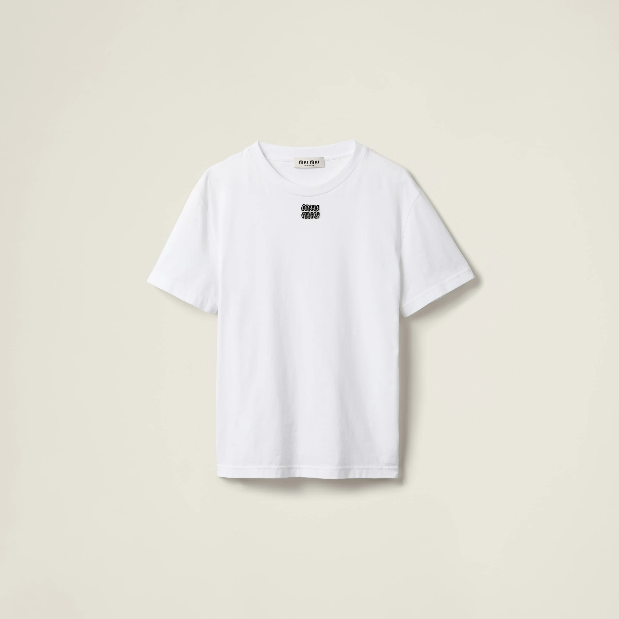 The embroidered Miu Miu logo stands out on the oversized, simple lines of this T-shirt thanks to its iconic touch. - Product code: MJN500_15OK_F0009_S_OOO - Oversized fit - Crew-neck - Short sleeves - Embroidered logo - Twin-needle hem - Imported - The model is 179 cm tall and wears a size 38 Height 49cm Materials Main material: 100% Cotton