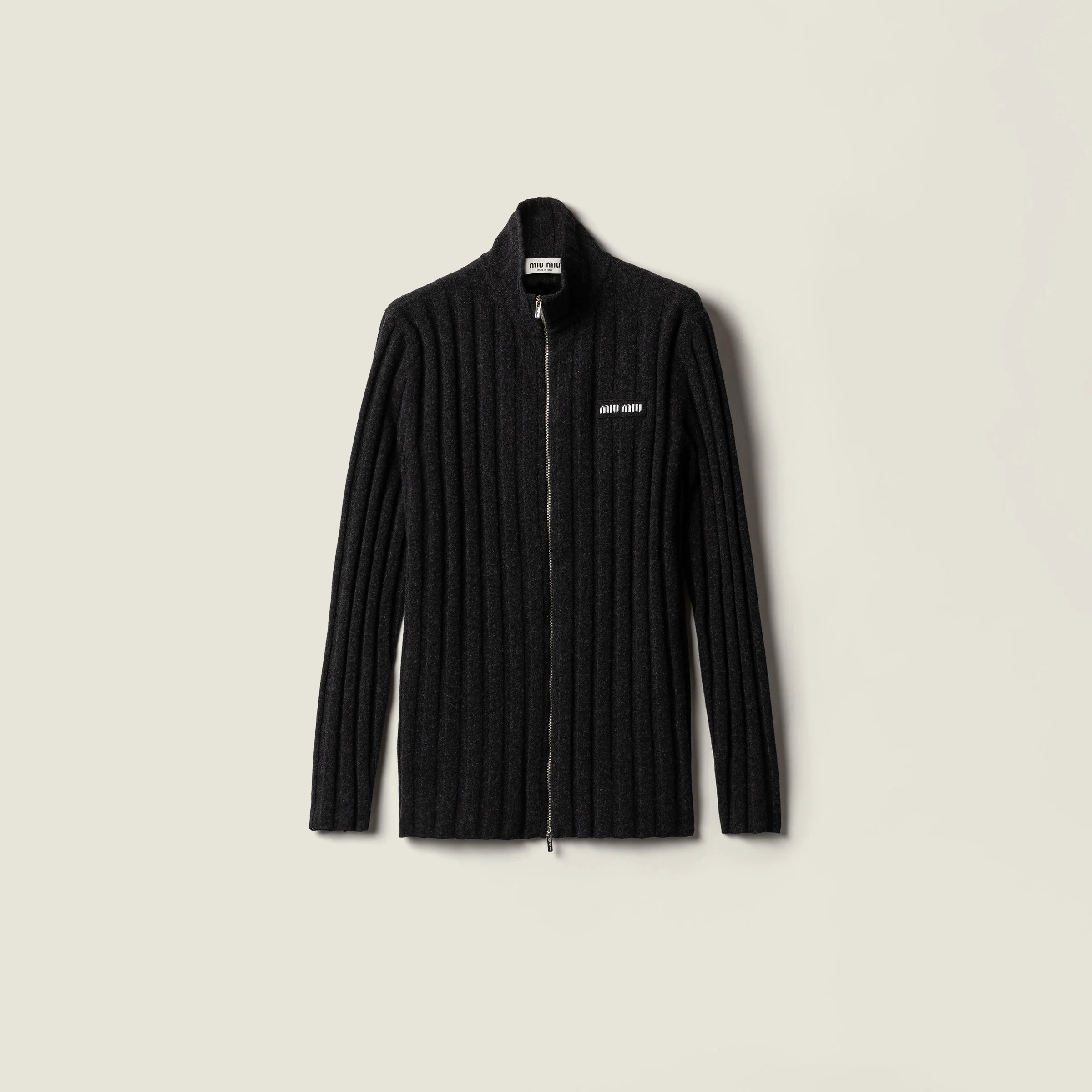 Miu Miu archive silhouettes are reinterpreted in the cool, minimalist essence of this ribbed knit cardigan made of a soft regenerated wool and cashmere yarn. This garment blends codes of the past and artisan innovation. - Product code: MMF01K_17JA_F0308_S_OOO - Ribbed knit - Straight fit - Long sleeves - Ribbed knit turtleneck - Semi-raglan shoulder - Front zipper closure - Knit logo patch - Imported - The model is 178 cm tall and wears a size 38 Height 70cm Materials Main material: 30% Recycled Cashmere 70% Recycled Wool