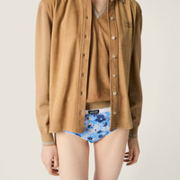 Inspired by the jackets seen on the runway, this shirt combines the sophistication of knitwear with the distinctive character of suede, reinterpreting Miu Miu wardrobe classics with a contemporary twist. - Product code: MMF01R_18TK_F0040_S_OOO - Plain knit - Regular fit - Long sleeves - Semi-raglan shoulder - Front button closure - Ribbed knit cuffs - Suede front and logo - Imported Height 62cm Materials Main material: 100% Virgin Wool