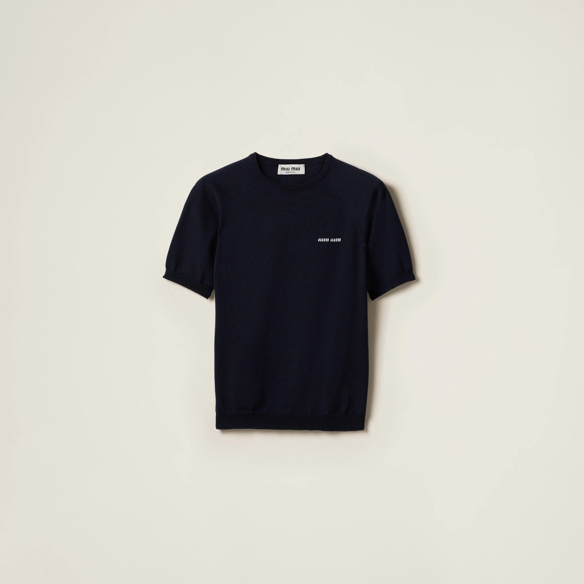 The simple style of this wool sweater embodies Miu Miu's versatile elegance, creating style combinations characterized by iconic layering. - Product code: MMLA63_16WJ_F0008_S_OOO - Plain knit - Slim-fit silhouette - Short sleeves - Ribbed knit crew-neck - Raglan shoulder - Ribbed knit sleeve trim and hem - Intarsia logo - Imported - The model is 179 cm tall and wears a size 38 Height 60cm Materials Main material: 100% Virgin Wool