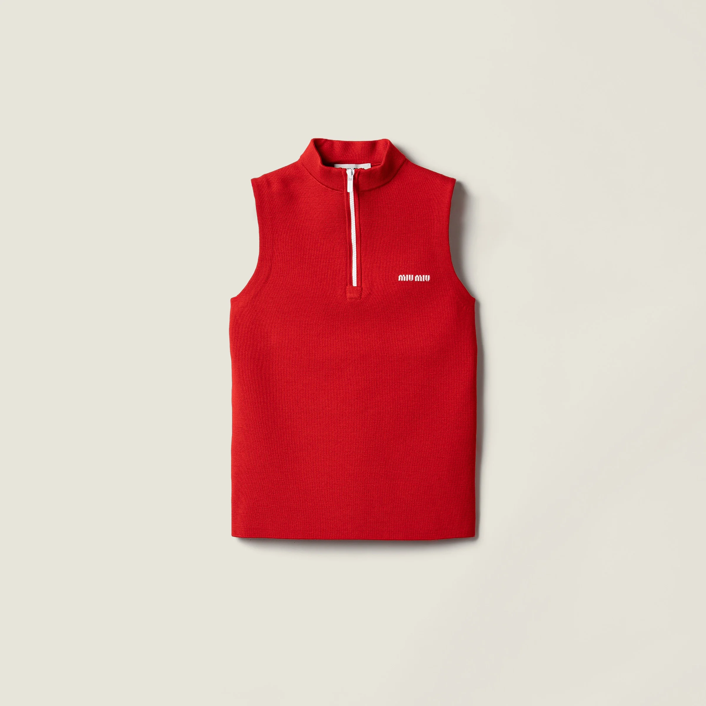 The sporty character of Miu Miu style codes blends with elegant knitwear, defining the versatile and contemporary allure of this sleeveless wool half-zipper sweater with contrasting logo. - Product code: MMV329_18SP_F0011_S_OOO - Plain knit - Straight fit - Sleeveless - Half zipper closure on the front - Semi-raglan shoulder - Intarsia logo - Imported Height 56cm Materials Main material: 100% Virgin Wool