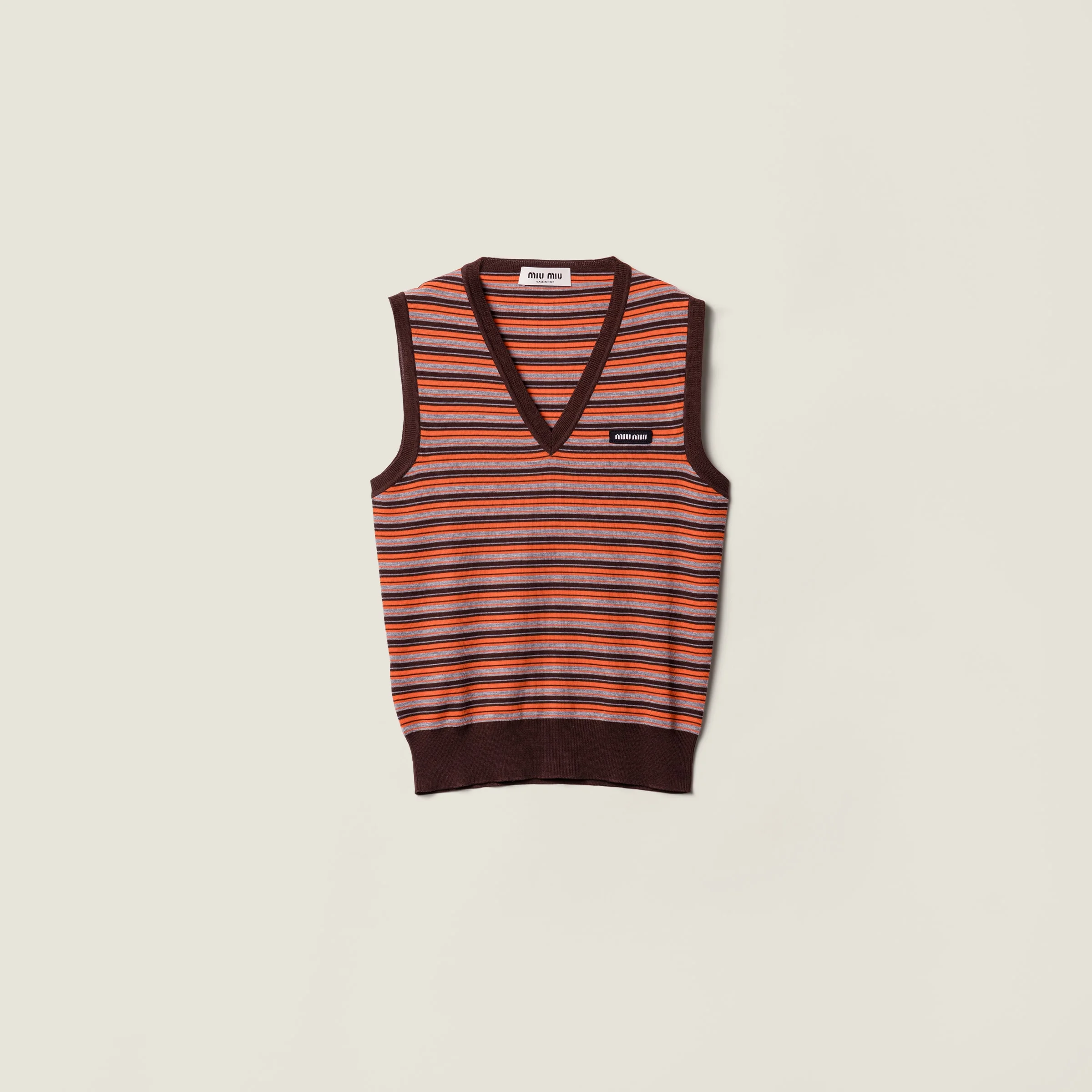 A play of color enhances Miu Miu's lively stripe motif, the protagonist of this iconic knit wool vest, an expression of the sophistication of a simple garment with a contemporary fit. - Product code: MMV337_1844_F0049_S_OOO - Plain knit - Regular fit - Sleeveless - V-neck - Semi-raglan shoulder - Ribbed knit hem - Knit logo patch - Imported - The model is 177 cm tall and wears a size 38 Height 54cm Materials Main material: 100% Virgin Wool
