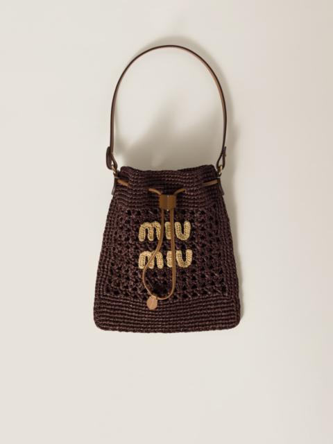 An exotic and refined design characterizes this mini-bag made of woven fabric. The Miu Miu logo stands out thanks to its immediate iconic character while the leather handle and drawstring complete the style with a refined contrast. - Product code: 5ND016_2DO1_F04EW - Raffia-effect yarn - Drawstring closure - Embroidered lettering logo - Leather handle - Unlined - Imported Height 23cm Width 20cm Materials Main material: Viscose