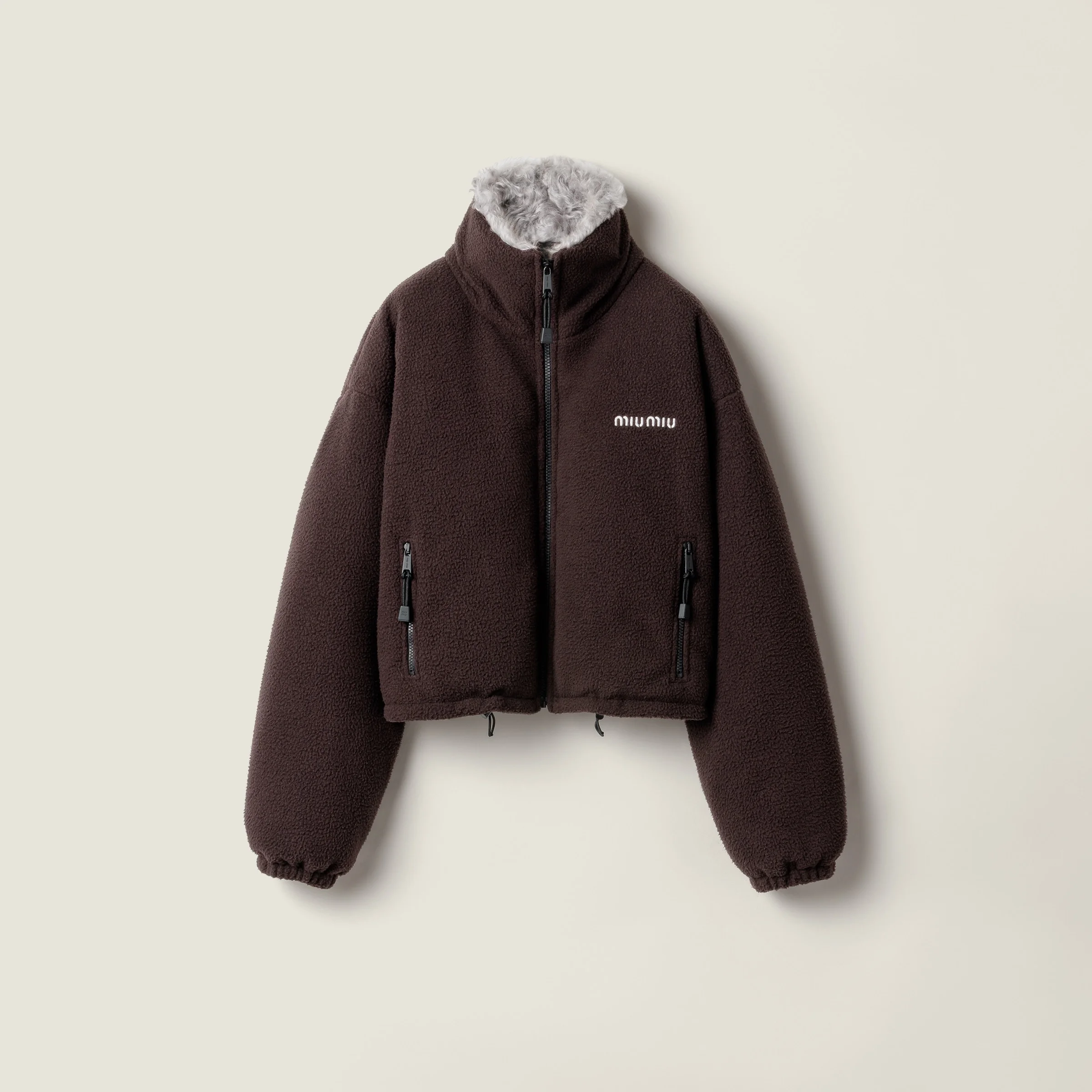 Warm fleece and light down padding continue the Miu Miu story about a high-performance, contemporary wardrobe. Clean lines and sporty details define a garment with bold style and an iconic essence. - Product code: ML1147_18FC_F0192_S_OOO - Cropped down jacket - Goose down padding - Fur-lined collar - Long fitted sleeves - Elasticized cuff - Zipper closure - Zipper pockets - Elasticized drawstring hem - Embroidered logo - Imported - The model is 178 cm tall and wears a size 38 Height 53cm Materials Nylon