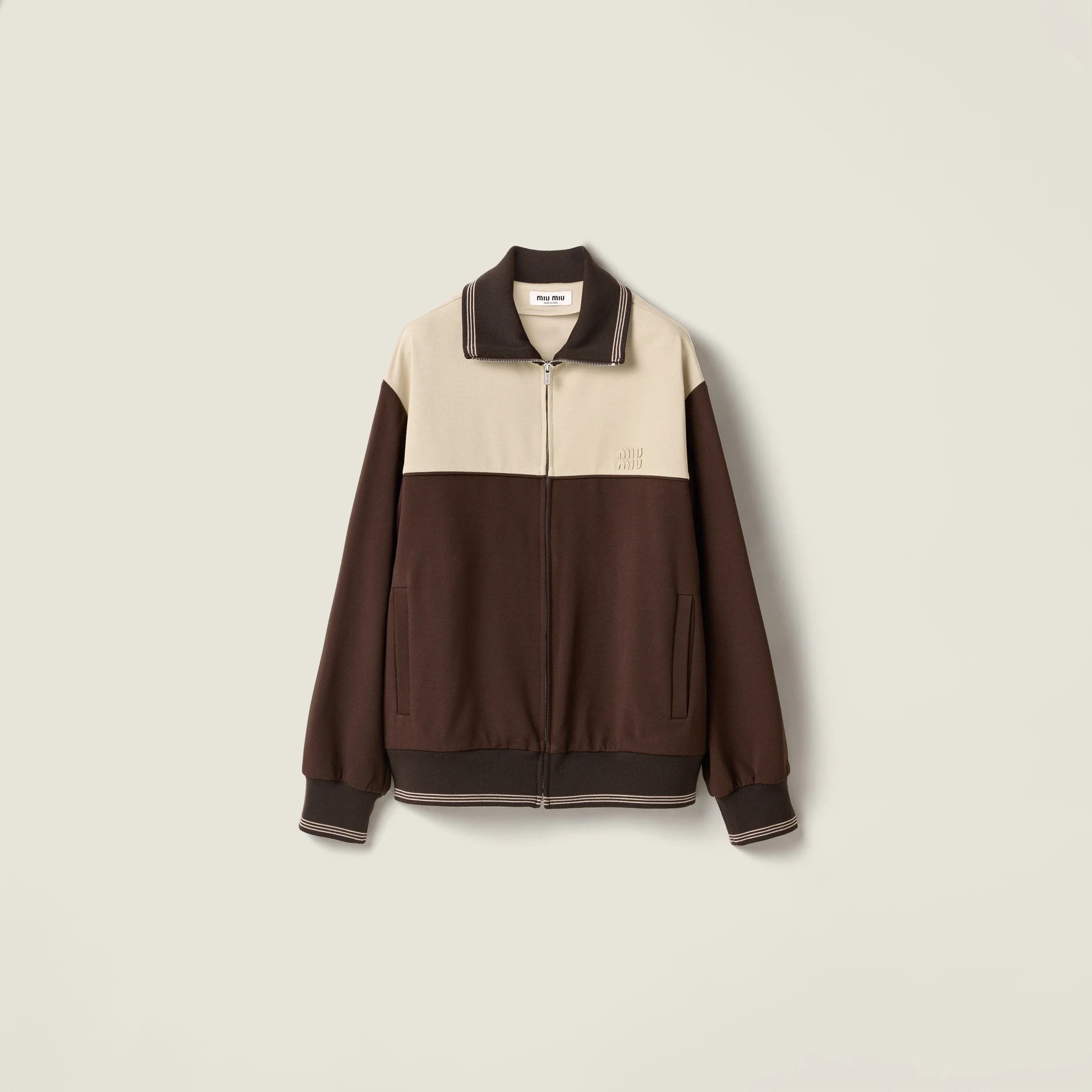 The refined sporty spirit of this viscose zipper sweatshirt is enhanced by relaxed lines and delicate embroidered logo details, embodying Miu Miu’s authentic experimentation and expressing a constantly evolving femininity. - Product code: MJLA02_18FX_F049E_S_OOO - Loose fit - Long sleeves with knitted cuffs - Polo collar - V-neckline - Front zipper closure - Side pockets - Straight hem with knitted trim - Embroidered logo - Imported - The model is 176 cm tall and wears a size 38 Height 75cm Materials Main material: 100% Cotton