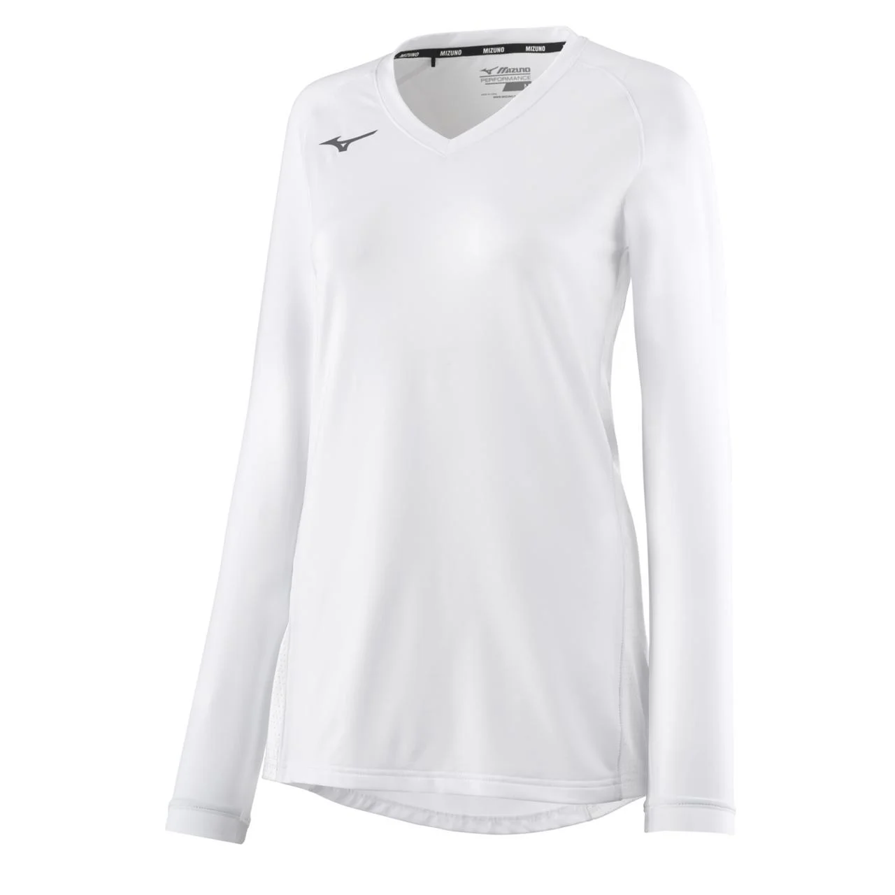 Elevate your game with the all-new Mizuno Spike Long Sleeve Volleyball Jersey, Engineered for the serious athlete. Crafted from advanced cationic dyed polyester that helps prevent dye migration with strategically placed mesh side panels to enhance ventilation, keeping you cool and dry during intense matches. This jersey offers unparalleled performance and style. - Athlete specific pattern: Allows for ease of movement - Flatlock construction - Hemmed bottom - Lightweight fabric: Allows athletes to feel cool during play. - Moisture wicking - Tagless Care Label: no itch label for added comfort! - Tailored fit allows for greater freedom of movement during play - Curved shirttail hem - MIZUNO RUNBIRD® logo - V-neck style - Cationic dyed fabric: Promotes easy wash and wear - Compliant "solid colored" jersey under Libero jersey regulations for NCAA, USAV, and NFHS.