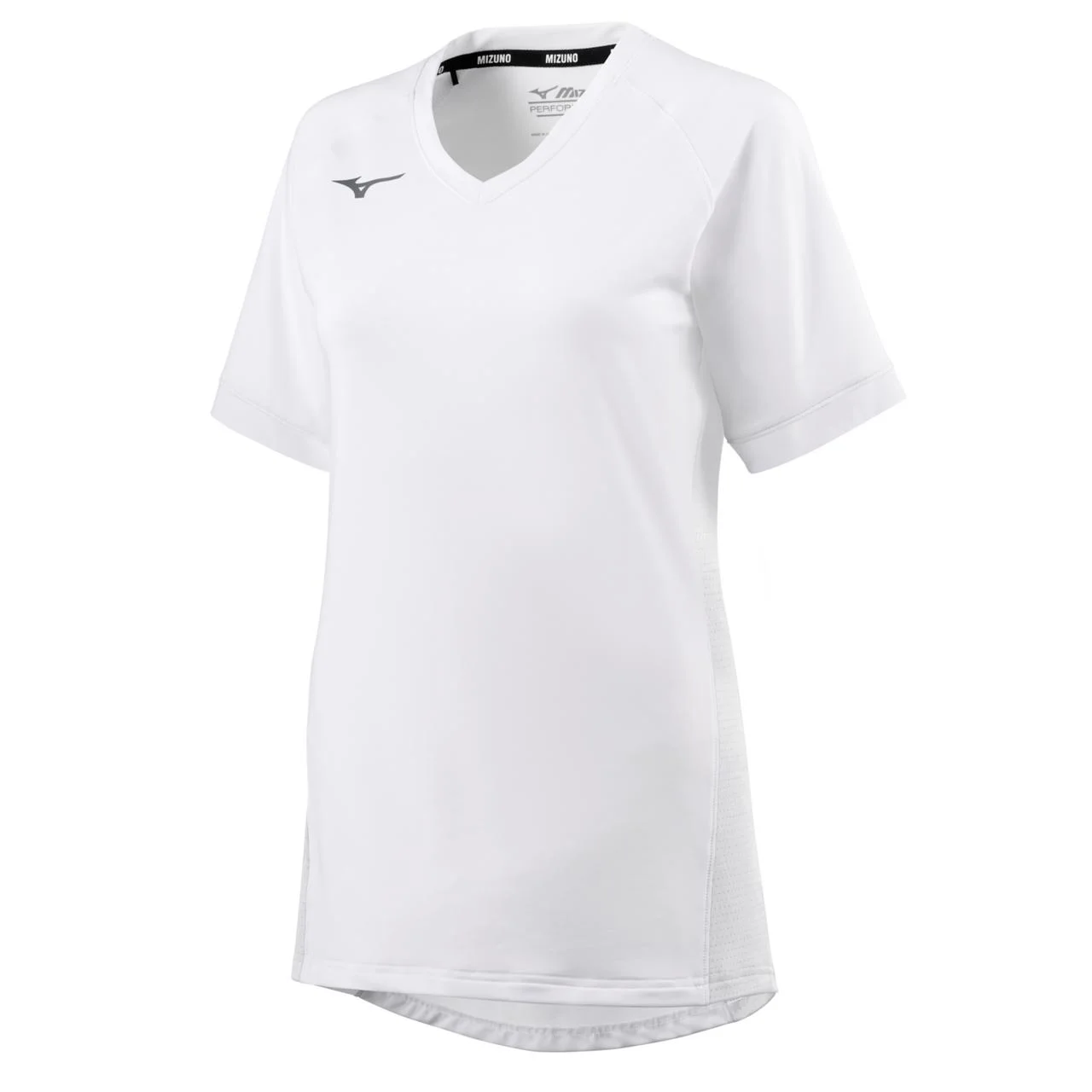 Elevate your game with the all-new Mizuno Spike Short Sleeve Volleyball Jersey, Engineered for the serious athlete. Crafted from advanced cationic dyed polyester that helps prevent dye migration with strategically placed mesh side panels to enhance ventilation, keeping you cool and dry during intense matches. This jersey offers unparalleled performance and style. - Athlete specific pattern: Allows for ease of movement - Curved shirttail hem - Contrast Insert Panels - Flatlock seaming - Hemmed bottom - Lightweight fabric: Allows athletes to feel cool during play. - MIZUNO RUNBIRD® logo - Moisture wicking - Tagless Care Label: no itch label for added comfort! - Tailored fit allows for greater freedom of movement during play - V-neck style - Cationic dyed fabric: Promotes easy wash and wear - Compliant "solid colored" jersey under Libero jersey regulations for NCAA, USAV, and NFHS.