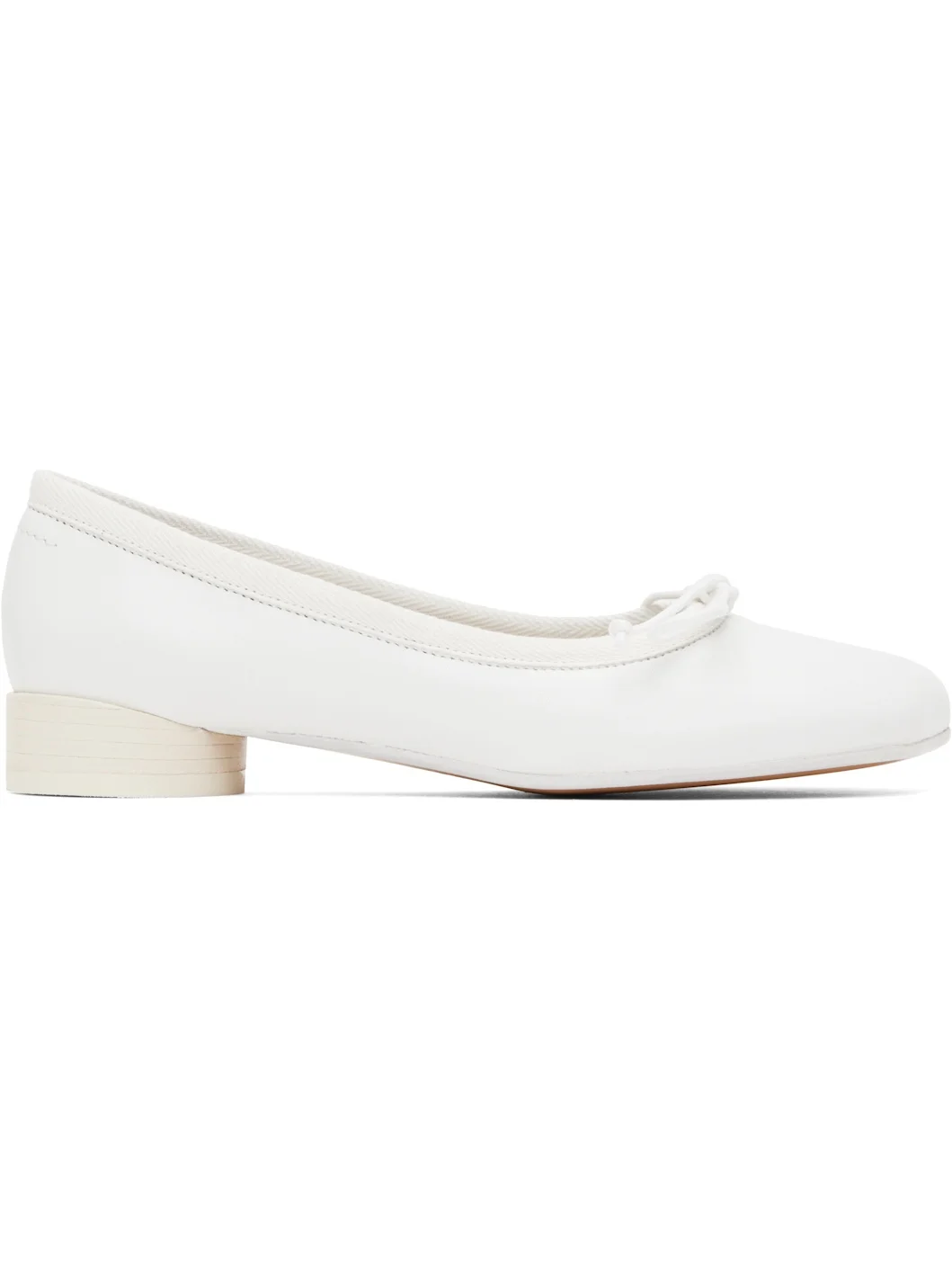 Grained nappa sheepskin ballerina flats in white. · Modified square toe · Bow accent at vamp · Signature white stitching at heel tab · Logo embossed at padded footbed · Buffed calfskin lining · Cylindrical stacked leather heel · Calfskin sole with rubber injection Supplier color: White Upper: sheepskin. Sole: calfskin, rubber. Made in Italy 251188F118005
