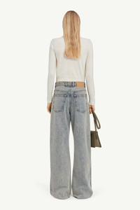 Mid-weight 5-pocket blue jeans cut to loose, wide legs. MM6’s discreet yet distinct signature, a horizontal line of white stitches, is also found on the back of the garment. Product Details Item ID S52LA0234S30844962 Primary fabric: 100% cotton Secondary fabric: 100% cotton Pocket lining: 65% polyester, 35% cotton Mid-weight blue denim 5-pocket trousers Two tone Wide leg Zip and button closure White stitch line and MM6 numeric signature jacron label at the back Made in Italy Model is 5'8'' tall and wears a size 28.