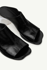 Crafted in wrinkled calf leather, the open-toe mule is shaped by MM6’s distinctive Anatomic stitch toe. A transparent cylindrical heel contrasts the soft, sculpted upper, balancing architectural precision with subversive detail. Product Details Item ID S59WP0215P7560T8013 Upper: 100% calf leather Lining: 100% calf leather Inside: 100% calf leather Sole: 100% calf leather Contrast: 100% rubber Cylindrical transparent heel Open toe Made in Italy