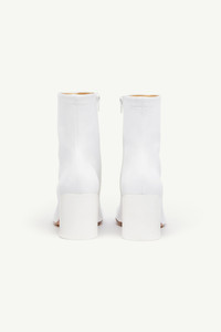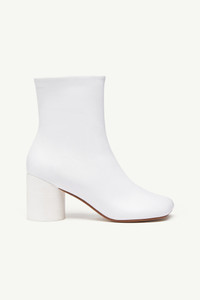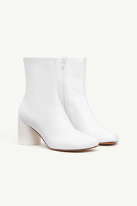 Anatomic ankle boots in nappa leather with a curved tonal heel and inner side zip. MM6’s discreet yet distinct signature, a horizontal white stitch line, is present on the back of the shoes. Product Details Item ID S66WU0074P3628T1002
