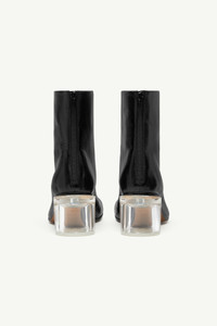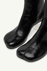 The ankle boot in wrinkled calf leather is structured around MM6’s iconic Anatomic stitch toe. Elevated on a cylindrical transparent heel, the design reframes a classic silhouette with light-bending contrast and subversive proportion. Product Details Item ID S59WU0265P7560T8013 Upper: 100% calf leather Lining: 100% calf leather Inside: 100% calf leather Sole: 100% calf leather Contrast: 100% rubber Cylindrical transparent heel Tabi split toe Zip closure at the back White stitch line at the back Made in Italy