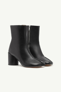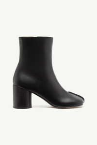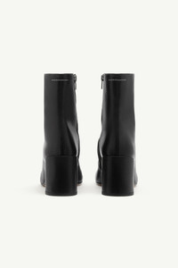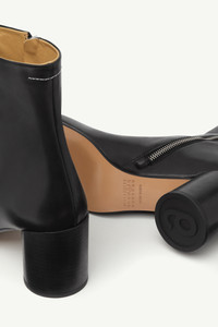 These slip on ankle boots are made from shiny leather with an anatomic toe and cylindrical heel. They hide a discreet zip closure on the inside of the style and are detailed by the brand's new stitch-out technique. MM6's discreet yet distinct signature, a horizontal white stitch line, is present on the back of the shoes. Product Details Item ID S59WU0249P5000T8013 Upper: 100% calf leather Lining: 100% calf leather Inside: 100% ovine leather Sole: 100% calf leather Heel height: 7 cm/2,8 in Ankle boots in shiny vegetable leather MM6 anatomic shape Cylindrical heel Zip closure on the inside White stitch line at the back Made in Spain