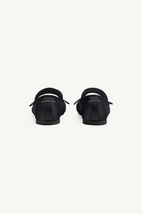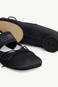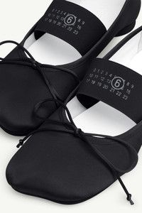 A perennial classic, MM6’s Anatomic line adds the ballet flat to its offer. Featuring a cylindrical tonal heel and numeric signature elastic on the ankle, the ballet flat is handcrafted in satin and detailed by a front bow and the ever present signature horizontal white stitch line embroidered on the back of the shoes. Product Details Item ID S59WZ0093P5560T8013 Upper: 100% polyester Contrast: 100% viscose Lining: 100% cotton Inside: 100% goat leather Sole: 100% calf leather Heel height: 2 cm/0,7 in Ballet flats in satin MM6 anatomic shape Cylindrical heel MM6 numeric signature elastic on ankle Front bow White stitch line at the back Made in Spain