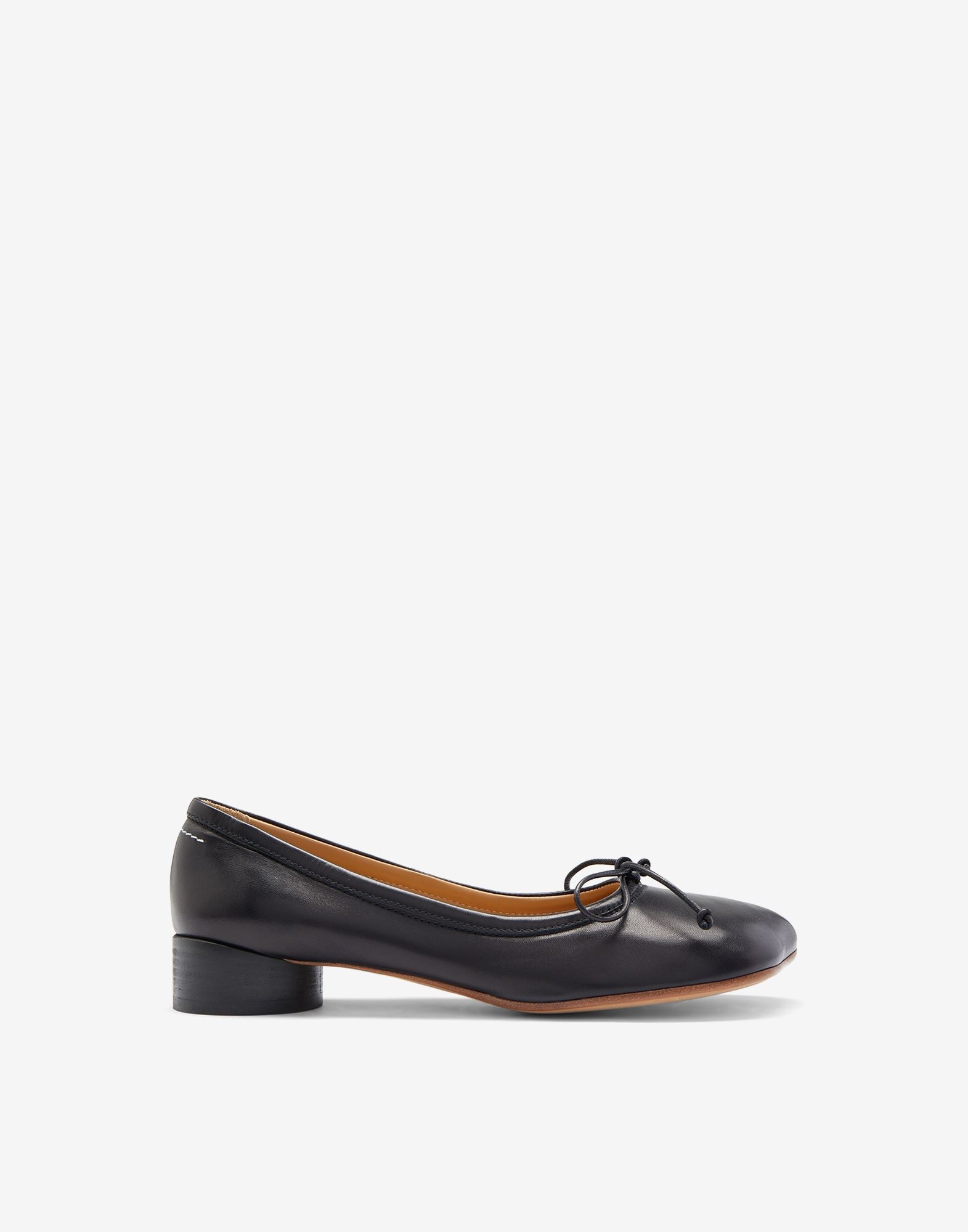 Ballet flats in nappa leather with the MM6 signature anatomical shape and bow detail. The signature MM6 stitchline adorns the back. Made in Italy. Item details 100% Ovine leather Geometric heel Square toeline Leather lining Leather sole