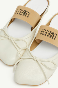 A perennial classic, MM6’s Anatomic line adds the ballet flat to its offer. Featuring a cylindrical tonal heel and numeric signature elastic on the ankle, the slip-on ballet flat is handcrafted in nappa leather and detailed by a front bow and the ever present signature horizontal white stitch line embroidered on the back of the shoes. Product Details Item ID S66WX0062P3628T1009 Upper: 100% ovine leather Contrast: 60% viscose-rayon, 40% cotton Lining: 100% calf leather Inside: 100% goat leather Sole: 100% calf leather Heel height: 2 cm/0,7 in Slip-on ballet flats in nappa leather MM6 anatomic shape Cylindrical heel MM6 numeric signature elastic on ankle Front bow White stitch line at the back Made in Spain