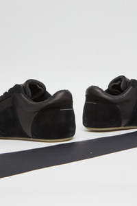 In a muted white palette, these sneakers refine everyday wear through a slim sole and an anatomic toe shape. The numeric signature at the side and signature white stitch line at the back encapsulate MM6’s subdued yet distinct language – an essential form distilled to its defining elements. Product Details Item ID S66WS0106P6435T8013 Upper: 100% calf leather Contrast: 100% calf leather Lining: 60% cotton, 40% polyester Inside: 100% calf leather Sole: 100% rubber Flat rubber sole Low-top sneaker silhouette Lace-up closure, seven eyelets per side Mix of smooth and suede panels on upper Perforation details on toe box Contrast panel on side Padded collar and tongue with shearling trim Small horizontal stitching on heel counter MM6 anatomic shape White stitch line at the back Made in Italy