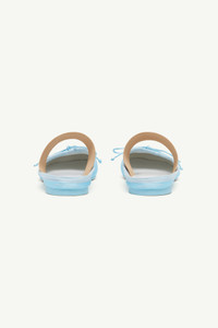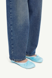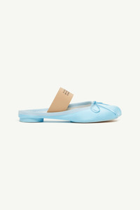 These satin slip-on ballet mules reinterpret a classic silhouette in MM6’s iconic anatomic shape. Featuring a bow to the front and numeric artwork on the ankle, they combine delicate detailing with playful, modern design. The white stitch line at the back subtly nods to the Maison’s identity, while the cylindrical heel adds just the right amount of lift. Product Details Item ID S59WX0074P5560T6231 Upper: 100% polyester Contrast: 60% viscose-rayon, 40% cotton Lining: 100% cotton Inside: 100% goat leather Sole: 100% calf leather Heel height: 2 cm Slip-on ballet flats in satin MM6 anatomic shape Cylindrical heel MM6 numeric signature elastic band Front bow White stitch line at the back Made in Italy