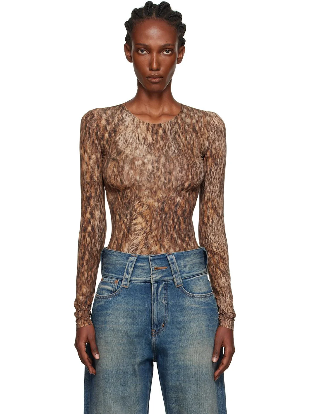 Stretch nylon jersey bodysuit. · Graphic pattern printed throughout · Crewneck · Press-stud fastening at bottom · White stitching at back collar Supplier color: Brown 73% polyamide, 27% elastane. Made in Italy 252188F358001