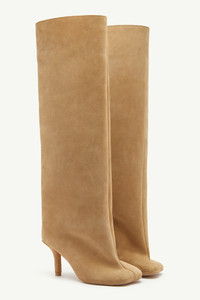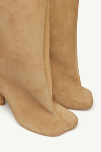 These slip-on knee-high boots are made from velvety soft suede with an anatomic toe and stiletto heel. MM6's discreet yet distinct signature, a horizontal white stitch line, is present on the back of the shoes. Product Details Item ID S59WW0109P6385T2076 Upper: 100% calf leather Lining: 100% calf leather Contrast: 100% cotton Sole: 100% calf leather Heel height: 7 cm/2,8 in Boots in suede Knee-height MM6 anatomic shape Stiletto heel Slip-on White stitch line at the back Made in Italy