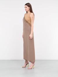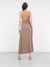 MM6 MAISON MARGIELA dress in brown, asymmetric layered design, paneled stretch nylon construction, round neck, back signature stitch detailing, sleeveless, armscyes, layered one-shoulder adjustable spaghetti strap, diagonal lace trim, side self-tie detailing, asymmetric layered hem, maxi-length, relaxed fit. Made in Italy Outer: 78% Polyamide 22% Elastane Contrast: 100% Polyester Standard Sizing Model is 5'10" wearing size S. Bust: 33" Waist: 24" Hips: 35"