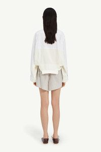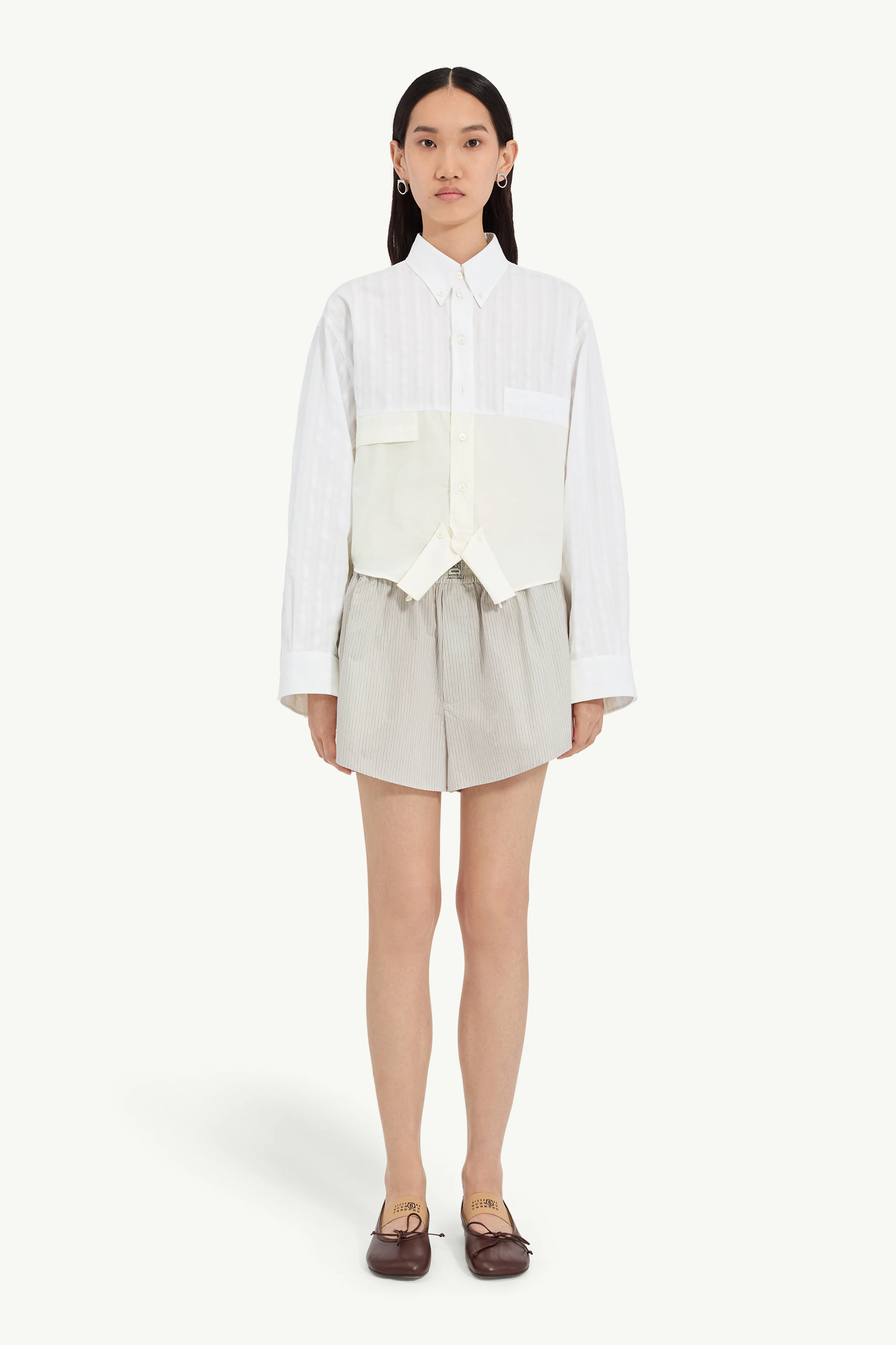In stripes and cotton poplin, this shirt plays with proportion and orientation. The mirrored hemline folds upward to create an unexpected finish, balanced by a clean collar and minimal detailing. A familiar silhouette transformed, it asserts MM6’s deconstructive spirit. Finished with the white stitch line at the back. Product Details Item ID S52DT0058MTN128961 Primary fabric: 100% cotton Striped poplin and shirting detail Buttoned flap chest pockets Long sleeves Shirt collar Front button closure White stitch line at the back Made in Italy