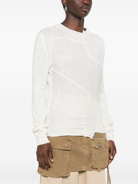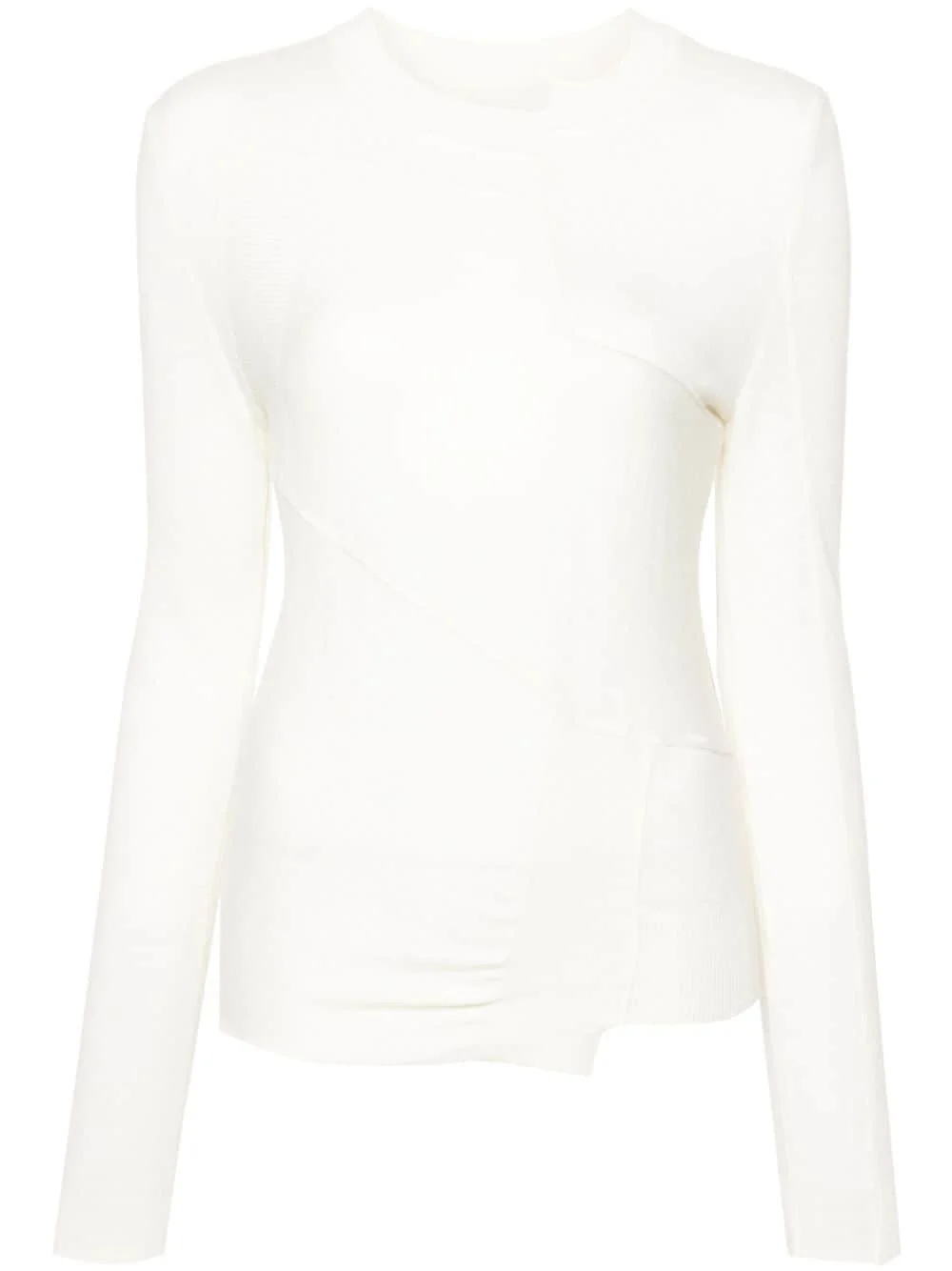 asymmetric virgin wool blend jumper Highlights - Chalk white - Virgin wool blend - Panelled design - Asymmetric design - Crew neck - Long sleeves Imported Composition Acrylic 50%, Virgin Wool 50% SIZE & FIT Model measurements Height 5 ft 10 in(1.77 m) Bust/Chest 32.28 in(82 cm) Hips 35.03 in(89 cm) Waist 25.19 in(64 cm) FittingInformation Designed for a slim fit that sits just away from the body offering a close yet comfortable fit The ribbed hem offers a close, comfortable fit Made with a lightweight knit, this piece offers some stretch This piece fits true to size – take your usual size