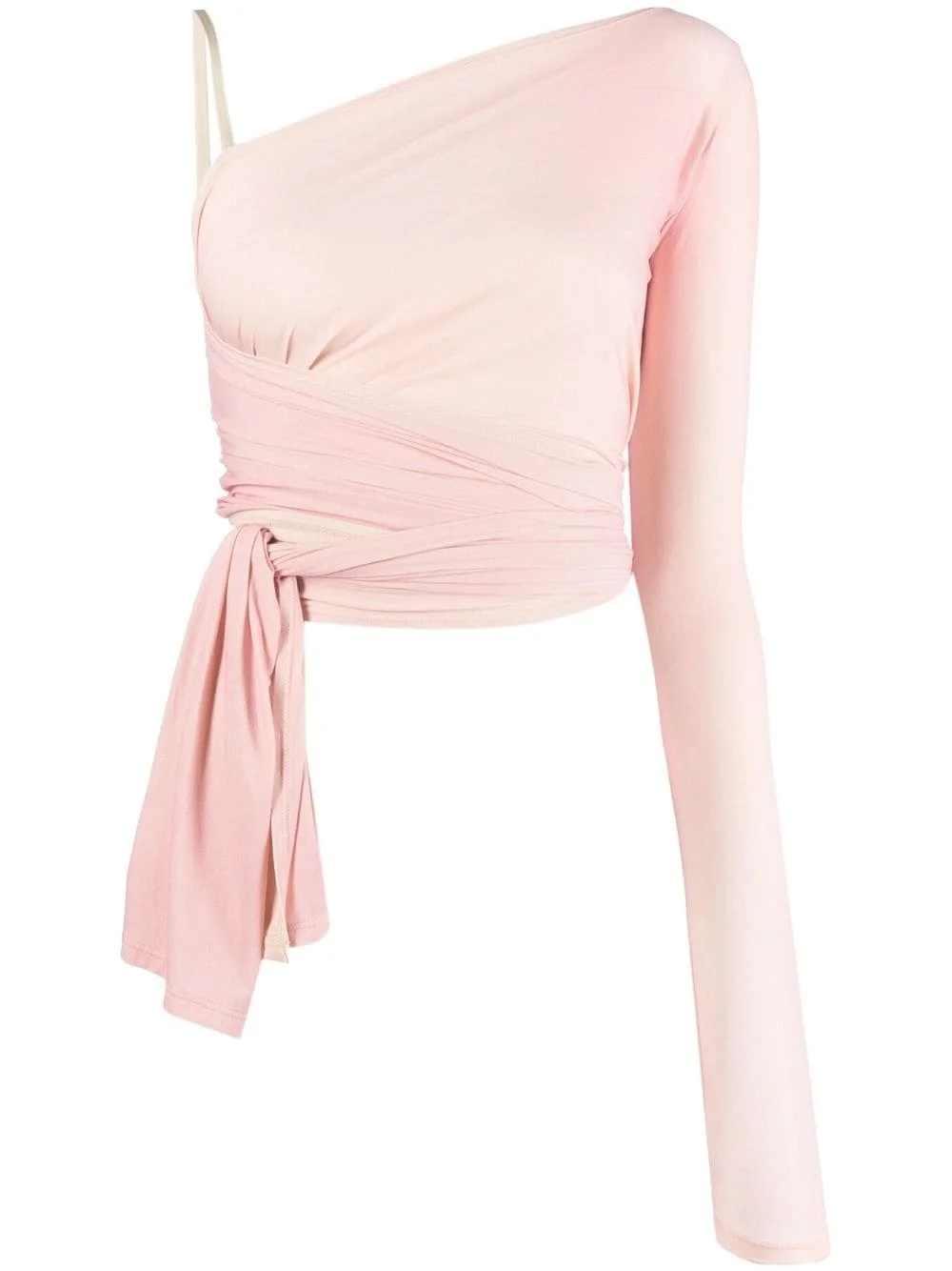 asymmetric wraparound cropped top Highlights - Blush pink - Stretch-design - Wraparound style - One-shoulder - Single long sleeve - Adjustable shoulder strap - Cropped - Straight hem Made in Italy Composition Polyamide 86%, Spandex/Elastane 14% SIZE & FIT Model measurements Height 5 ft 10 in(1.77 m) Bust/Chest 31.49 in(80 cm) Hips 36.22 in(92 cm) Waist 22.44 in(57 cm) FittingInformation Designed for a wraparound style that can be adjusted to your preference Made from a lightweight stretch fabric, this piece offers elasticity and flexibility when worn This piece fits true to size – take your usual size Washing instructions Hand Wash