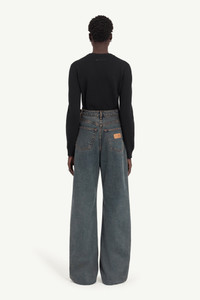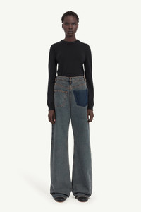 This denim design challenges convention by combining two back panels into one. Contrast-wash pockets disrupt expectations, offering a new take on classic denim. At the back, the MM6 white stitch line quietly reinforces the Maison's deconstructed ethos. Product Details Item ID S52LA0257S30844963 Primary Fabric: 100% Cotton Wide-leg jeans in washed denim Inverted construction with pocket illusion detail Patch pockets to the front and rear Numeric signature label White stitch line at the back Made in Italy Model is 180 cm tall and wears a size 28.