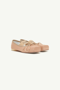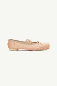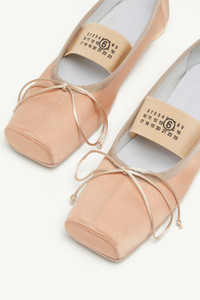 These satin ballet flats fuse MM6’s anatomic shape with a sleek cylindrical heel for a contemporary take on a classic style. The front bow and numeric signature elastic on the ankle add subtle details, while the white stitch line at the back ties the design to the Maison’s distinctive aesthetic. A refined balance of comfort and modern elegance. Product Details Item ID S59WZ0100P5560T4097 Upper: 100% polyester Contrast: 60% viscose-rayon, 40% cotton Lining: 100% cotton Inside: 100% goat leather Sole: 100% calf leather Heel height: 2 cm Ballet flats in satin MM6 anatomic shape Cylindrical heel MM6 numeric signature elastic band Front bow White stitch line at the back Made in Italy