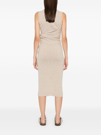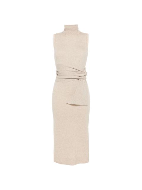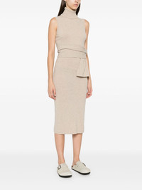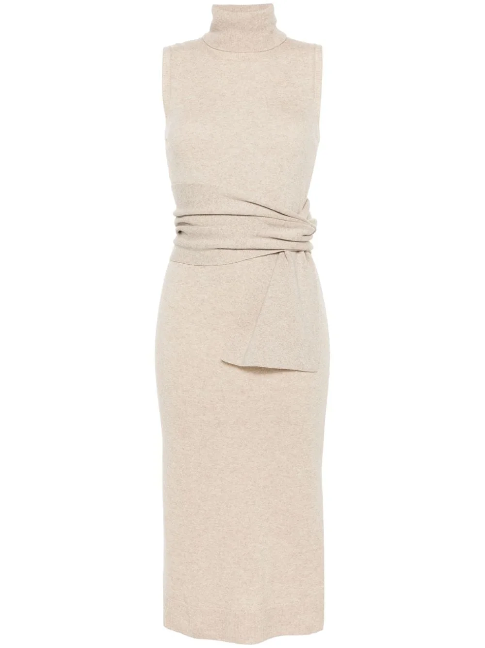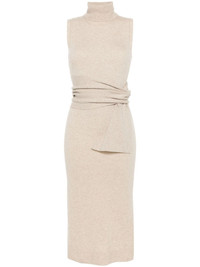 knitted midi dress Highlights - Sand beige - Wool blend - Knitted construction - Roll neck - Sleeveless - Ribbed cuffs and hem - Tied waist - Mid-length - Straight hem Made in Italy Composition Wool 80%, Polyamide 20% SIZE & FIT Model measurements Height 5 ft 10 in(1.78 m) Bust/Chest 33.85 in(86 cm) Hips 36.61 in(93 cm) Waist 26.77 in(68 cm) FittingInformation Designed for a slim fit that sits just away from the body offering a close yet comfortable fit The adjustable tie waist gives a more adaptable and personalised fit Made with a midweight knit, this piece offers some stretch