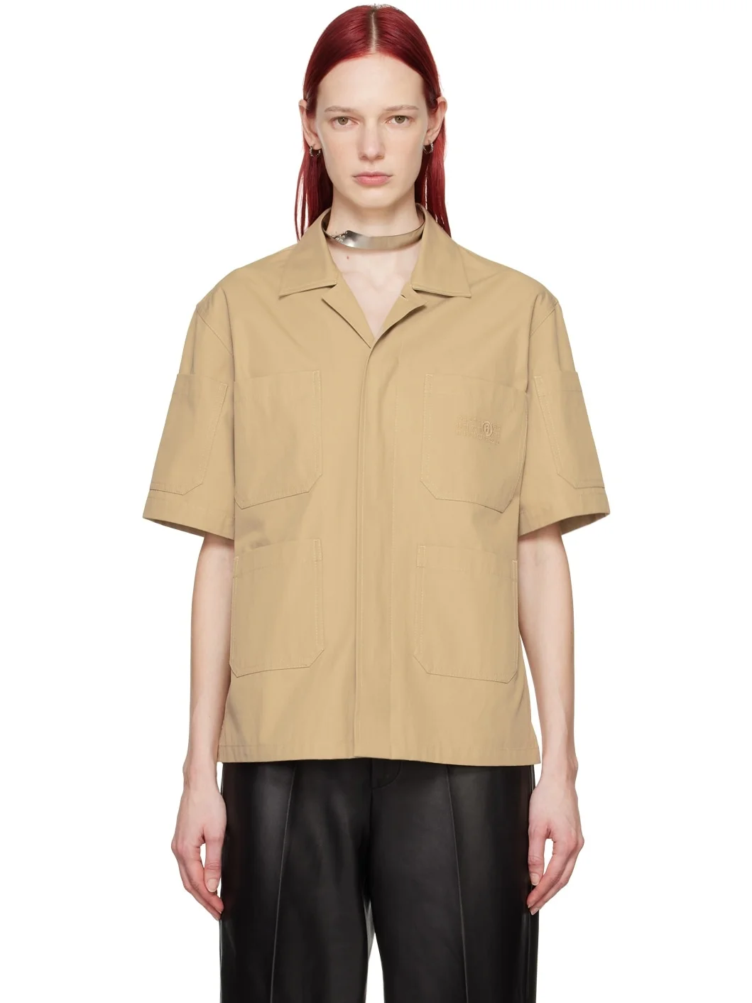Cotton gabardine shirt. · Spread collar · Concealed button closure · Logo embroidered at chest · Patch pockets at front · Vented side seams · Patch pocket at sleeves · White stitching at back collar Supplier color: Sand beige
