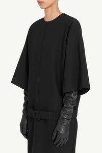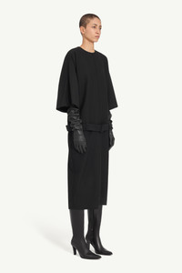 This pure wool midi dress features wide sleeves and a straight silhouette, defined by a tonal waist belt that rests gently at the hips. The minimalist design highlights MM6’s focus on shape and proportion. At the back, the MM6 white stitch line marks its signature. Product Details Item ID S62DG0055M35653900 Primary fabric: 100% wool Round neckline with centre seam Three-quarter wide sleeves Detachable tonal belt with buckle Concealed zip fastening at the back White stitch line at the back Made in Italy Model is 180 cm tall and wears a size 42.
