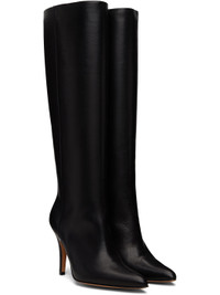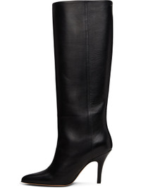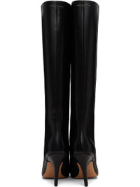 Knee-high grained calfskin boots. · Pointed toe · White stitching at heel collar · Buffed goatskin lining · Covered stiletto heel with rubber injection · Calfskin sole · Heel: H3.5" Supplier color: Black Upper: calfskin. Sole: calfskin, rubber. Made in Italy 252188F115001